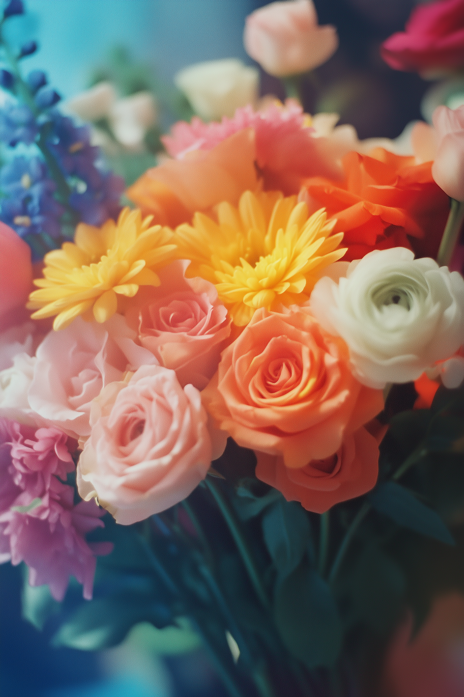 A vibrant bouquet with yellow daisies, pink and peach roses, and a white ranunculus, set against a softly blurred background.