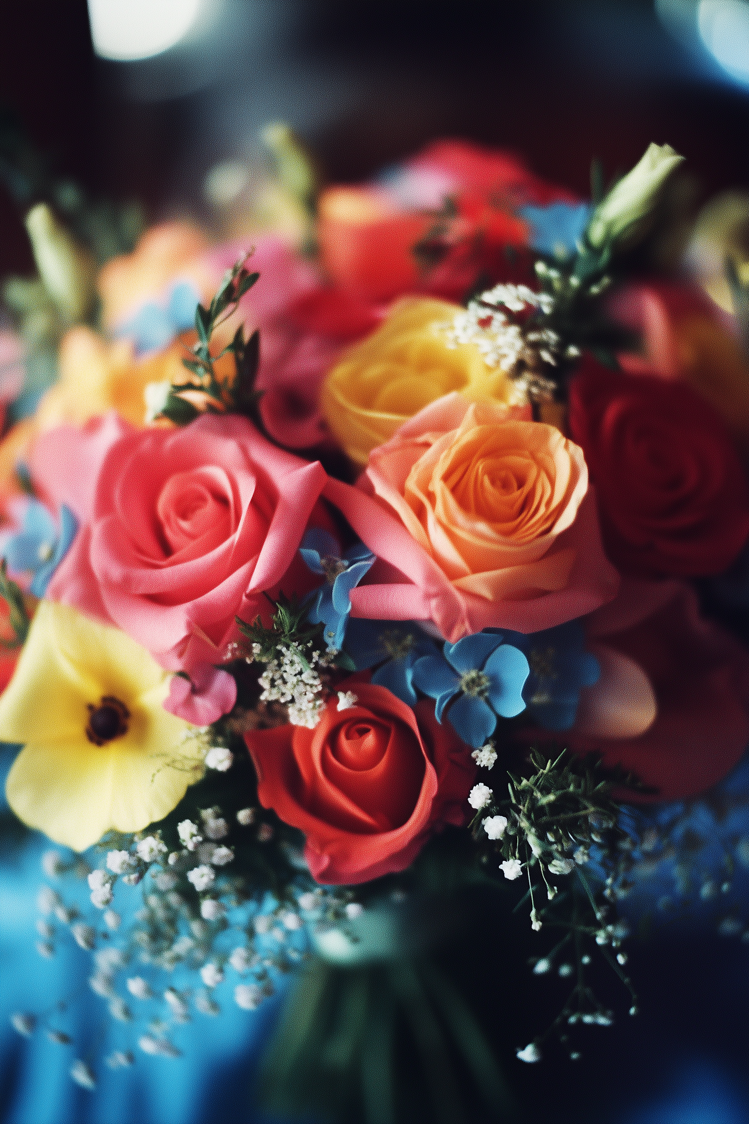 Vibrant bouquet with pink, yellow, and orange roses, blue flowers, and baby's breath, creating a lush and colorful floral display.