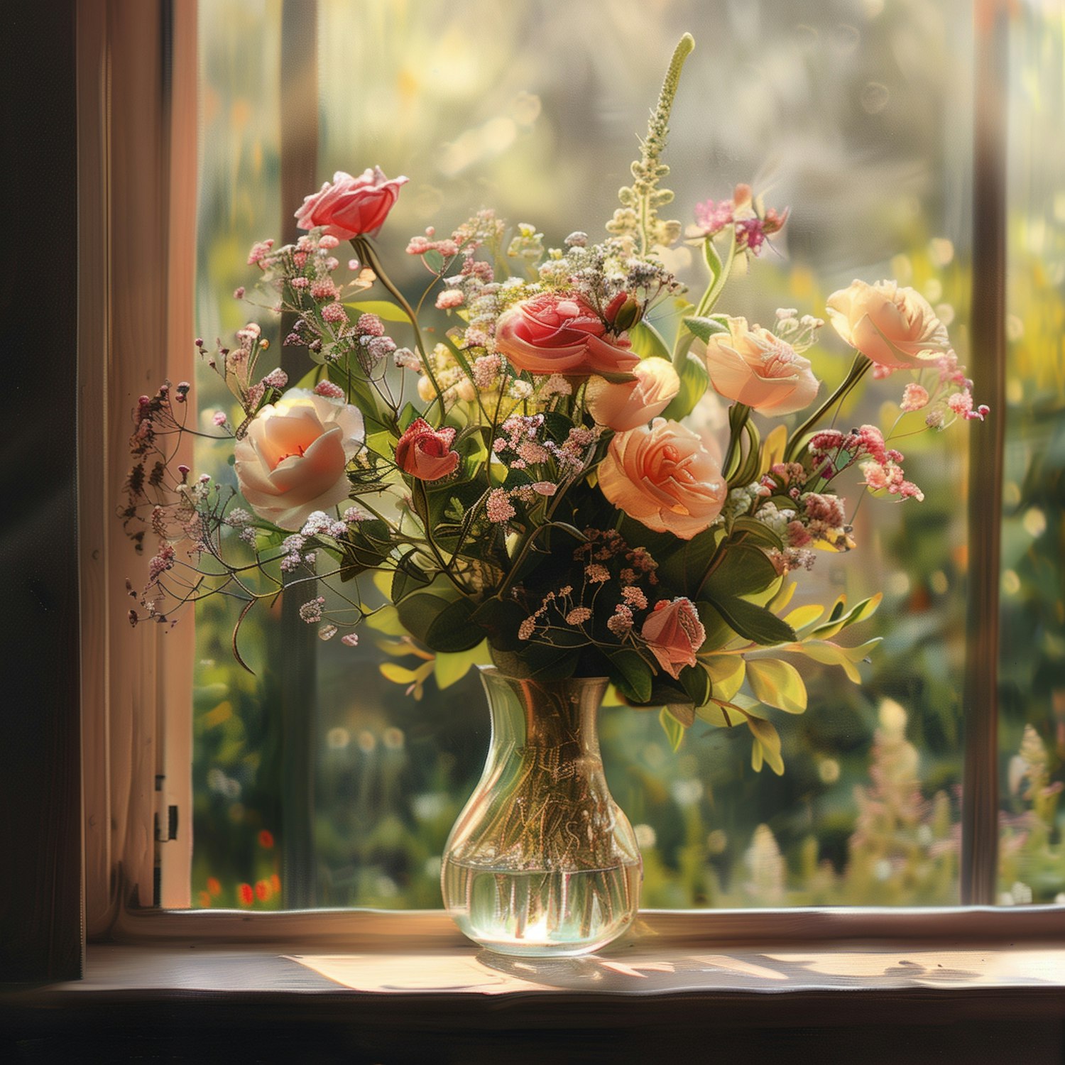 A sunlit bouquet of pink, peach, and white roses with baby's breath in a glass vase on a windowsill, framed by a blurred garden view.