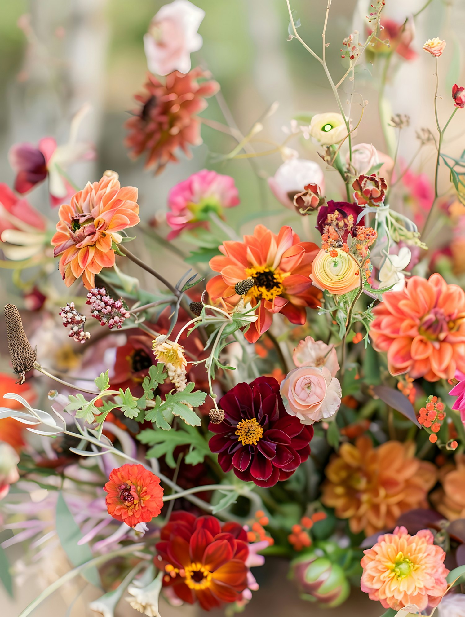A vibrant bouquet of red, orange, and pink flowers in a natural arrangement, highlighting rich colors and intricate details.