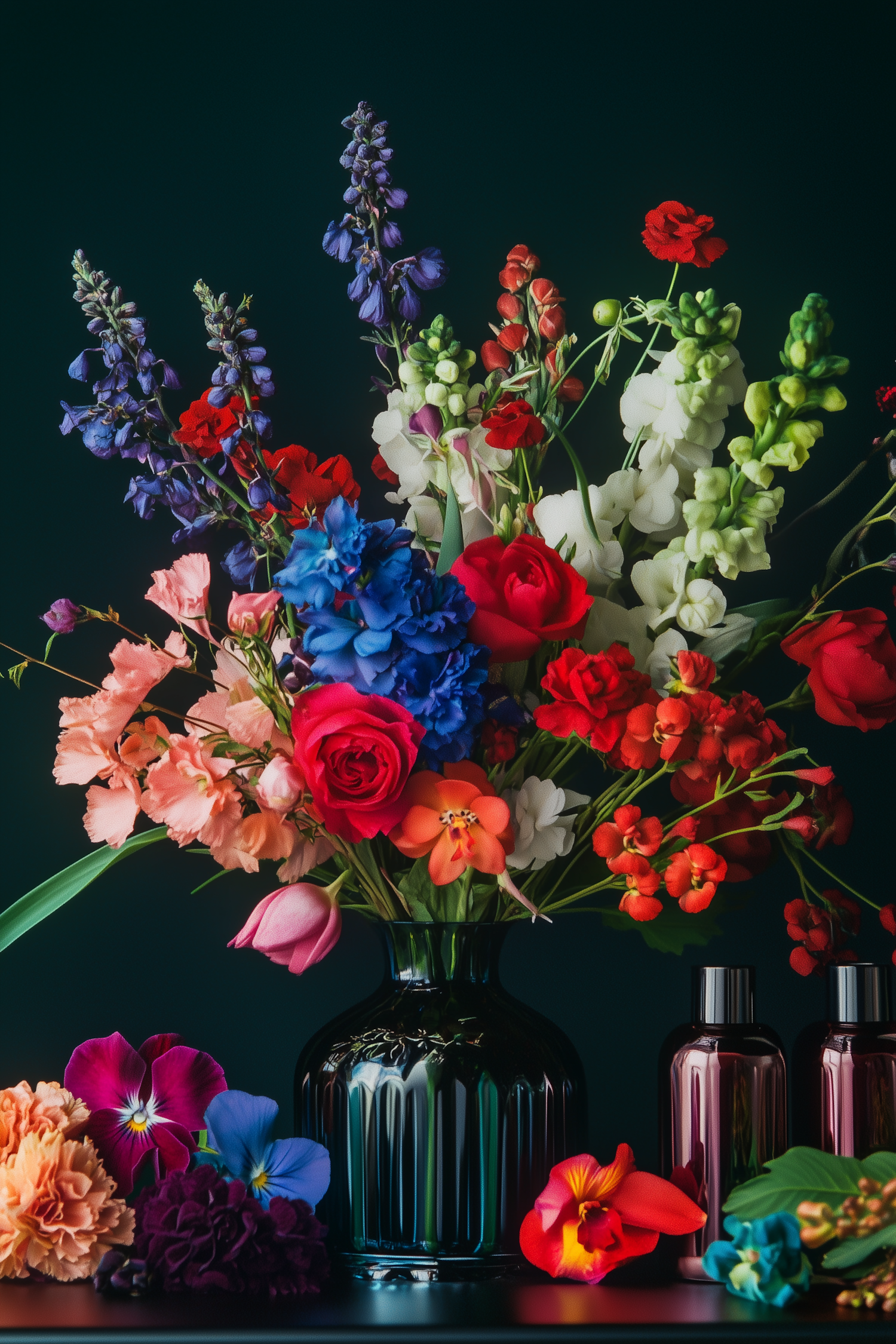 A stunning floral arrangement in a green vase with vibrant red, blue, and orange flowers, paired with metallic bottles on a dark background.