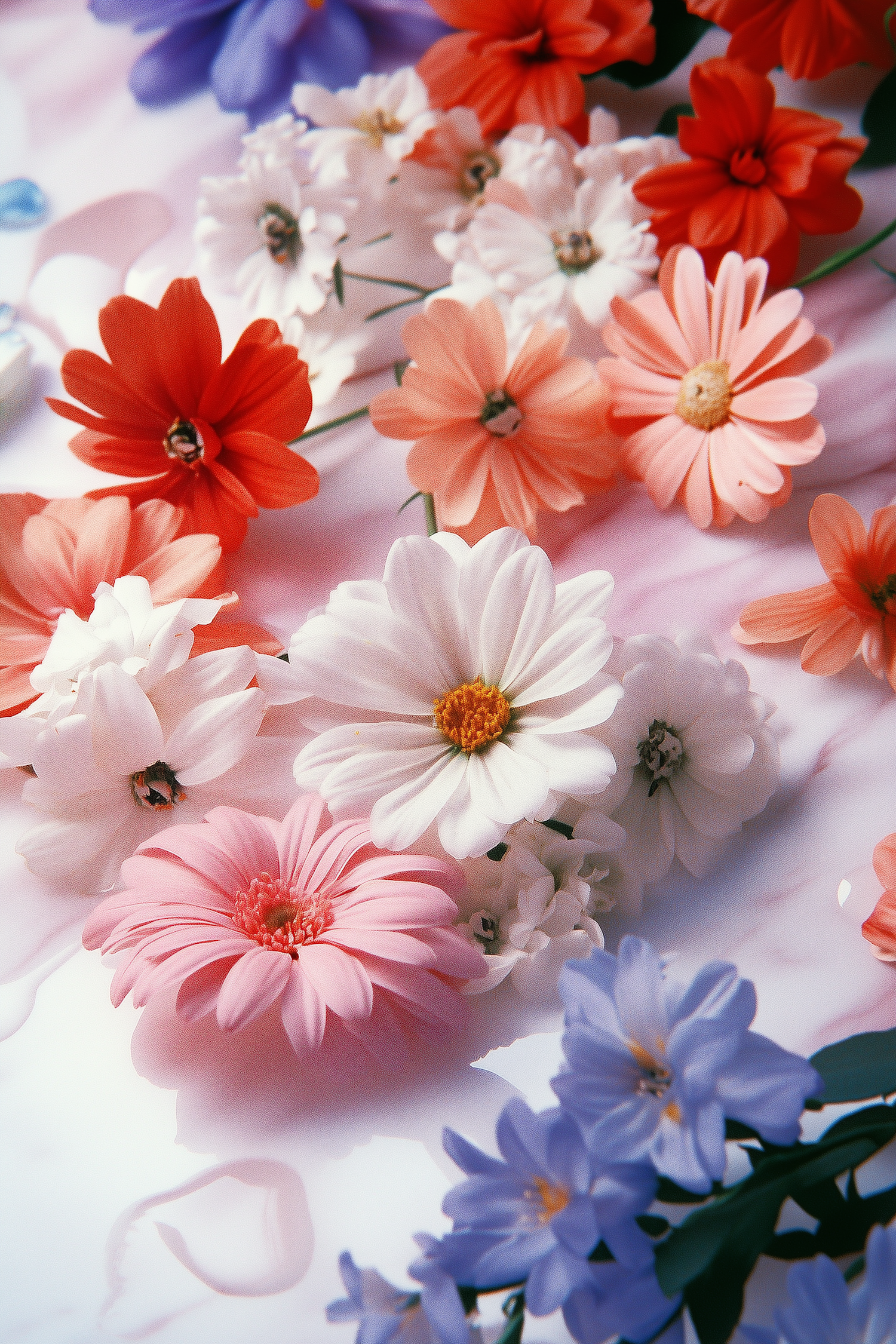 A dreamy arrangement of colorful flowers on a pink marble surface, featuring red, white, pink, and blue blooms in soft, pastel tones.