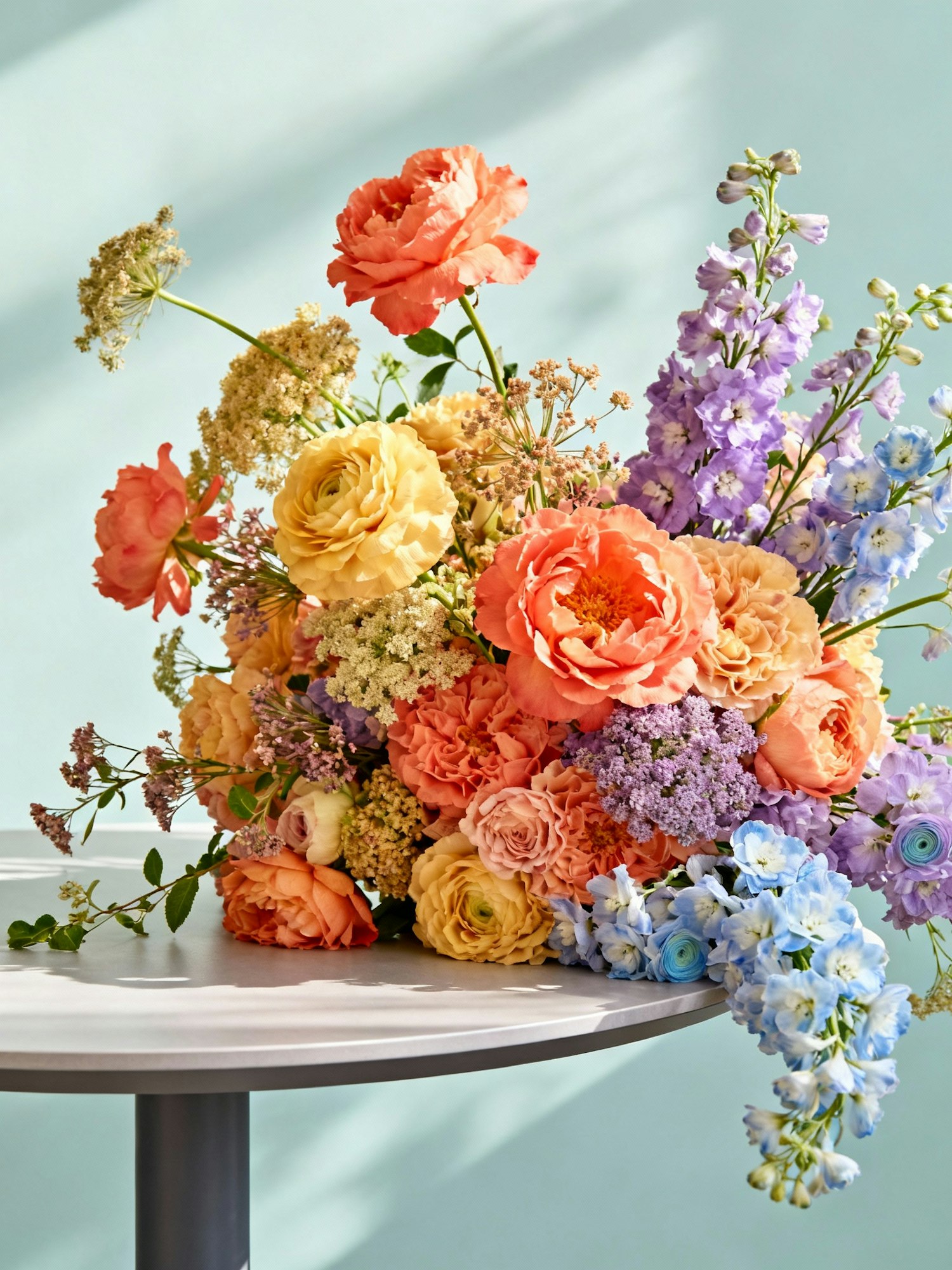 Vibrant bold aesthetic photograph, natural lifestyle style, soft daylight, candid framing, rich textures, colorful flower bouquets, not staged, influencer style photography, high quality realistic details — A large colorful bouquet placed on a modern round table, tones of coral, honey, lavender and periwinkle, flowers spilling naturally, vibrant and lush, minimal pastel background, lifestyle aesthetic vibe