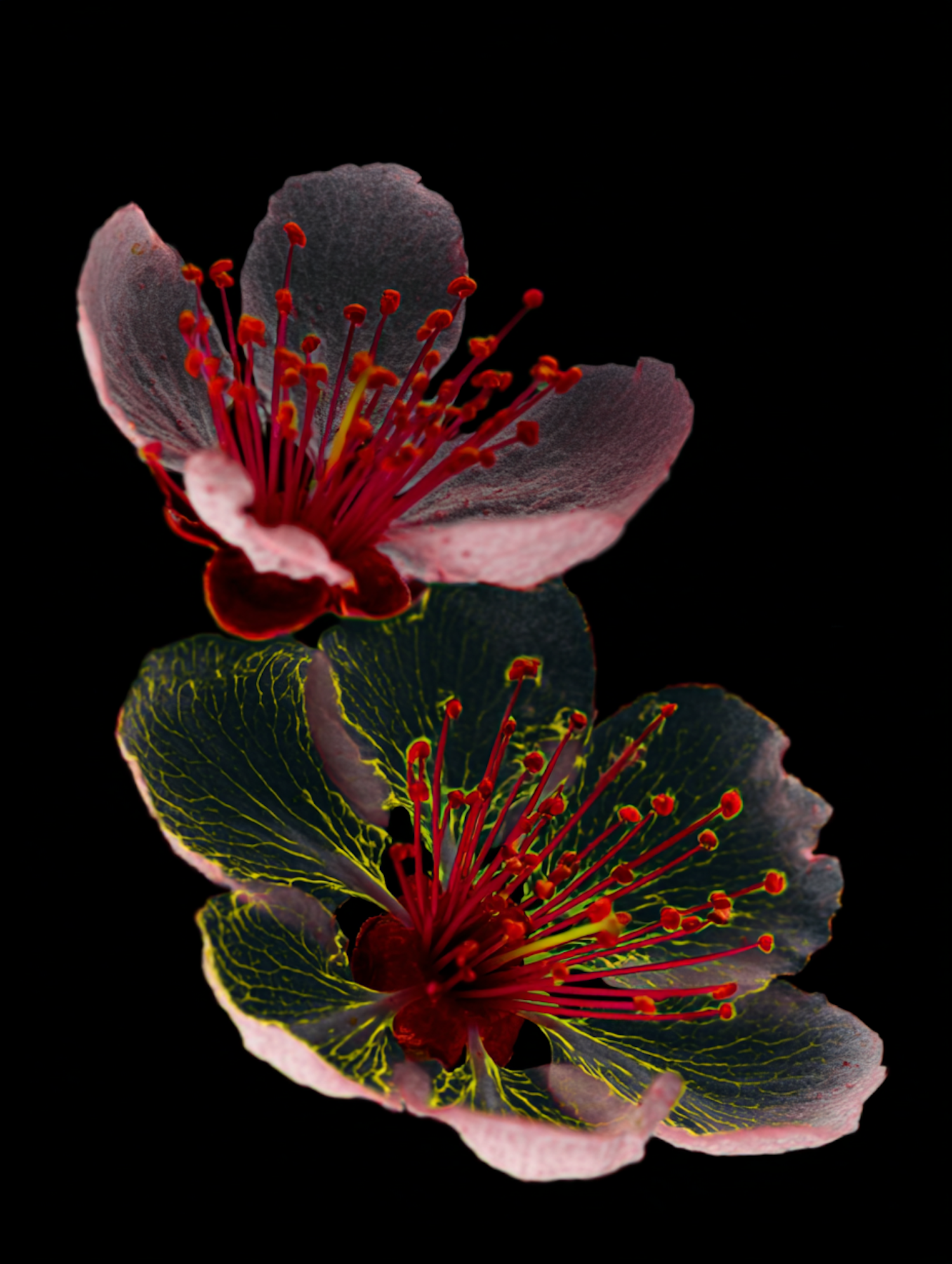 Close-up of two vibrant flowers with pink petals, red stamens, and glowing yellow-green veins against a black background.