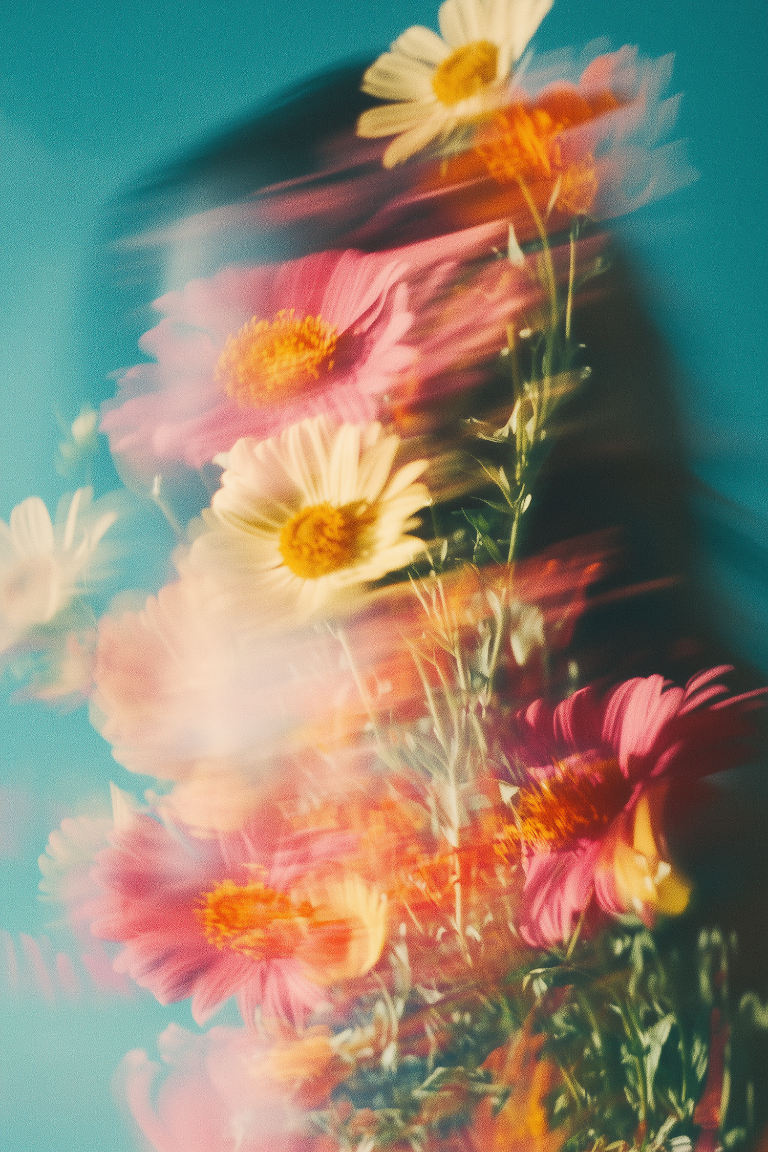 Dreamy blurred daisies in pink and yellow with teal background, creating a vibrant and ethereal floral composition.