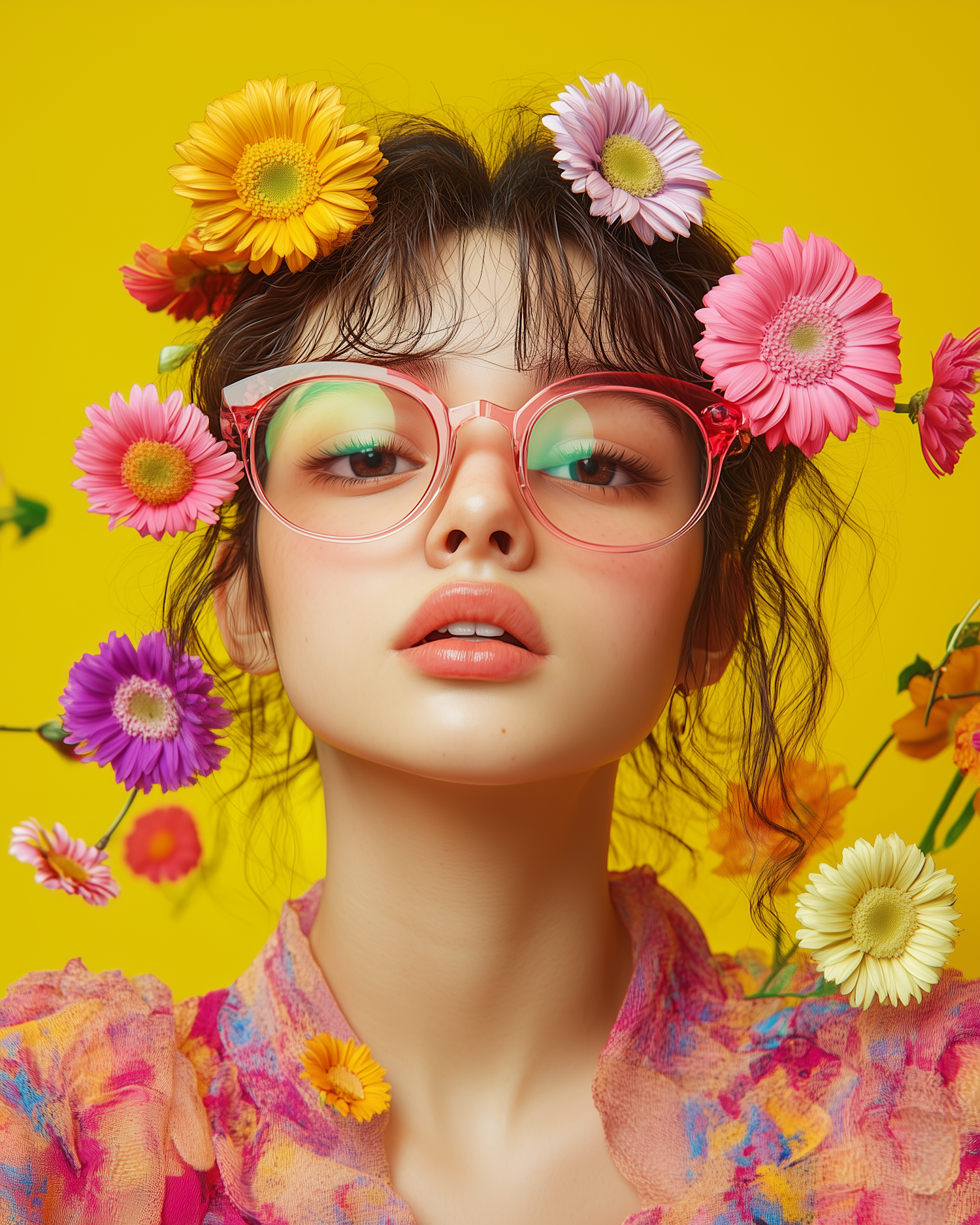 Bright portrait of a woman with pink glasses, floral hair decor, and a colorful blouse against a vibrant yellow background.