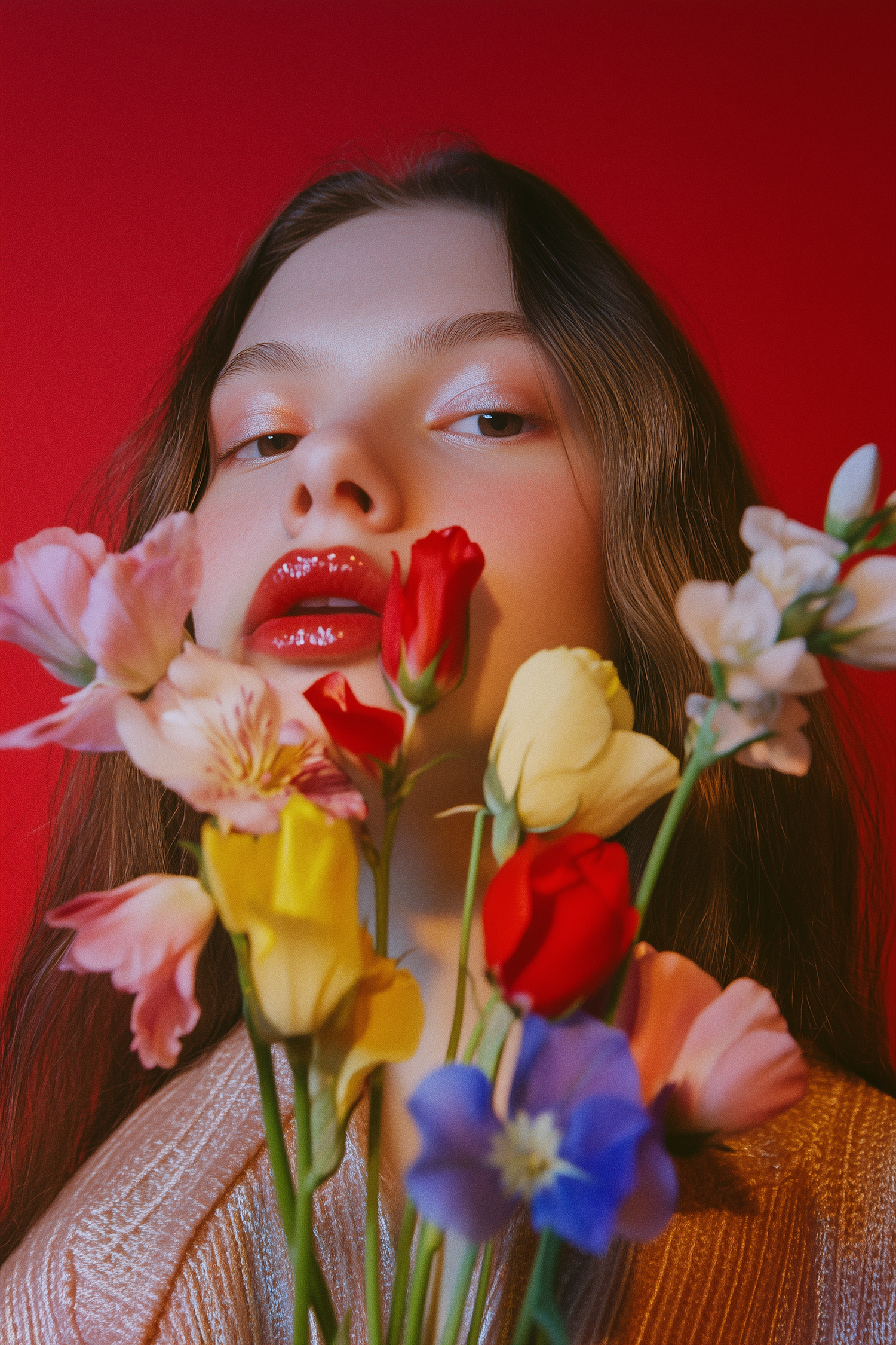 Close-up of a woman with glossy red lips and colorful flowers against a bold red background, creating a vibrant and artistic portrait.