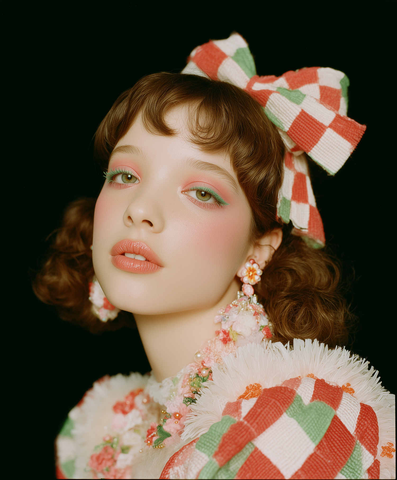 A close-up portrait of a young woman with vibrant makeup, a checkered bow, and floral accessories against a dark background.
