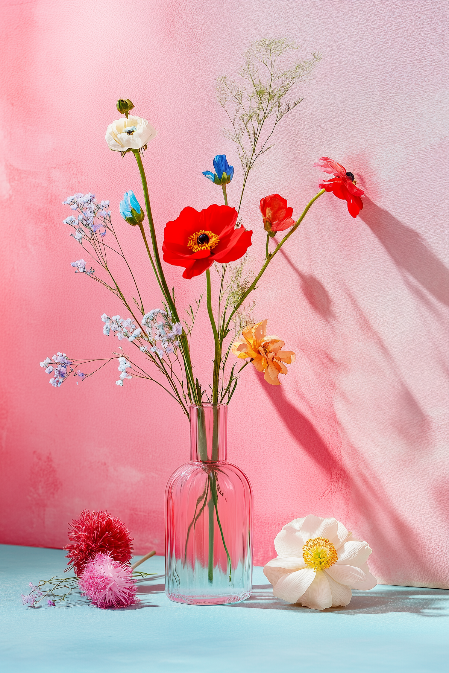 A colorful floral arrangement in a pink-gradient vase on a blue surface, set against a pink background. Perfect for spring vibes!