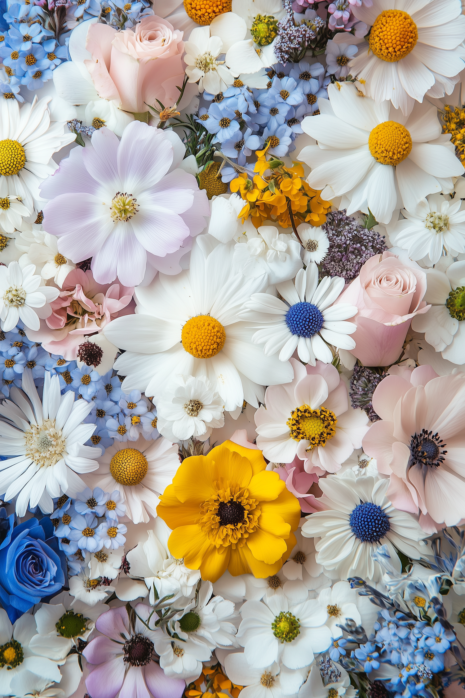 A vibrant floral arrangement with white daisies, pink roses, and blue forget-me-nots, creating a lively and colorful display.