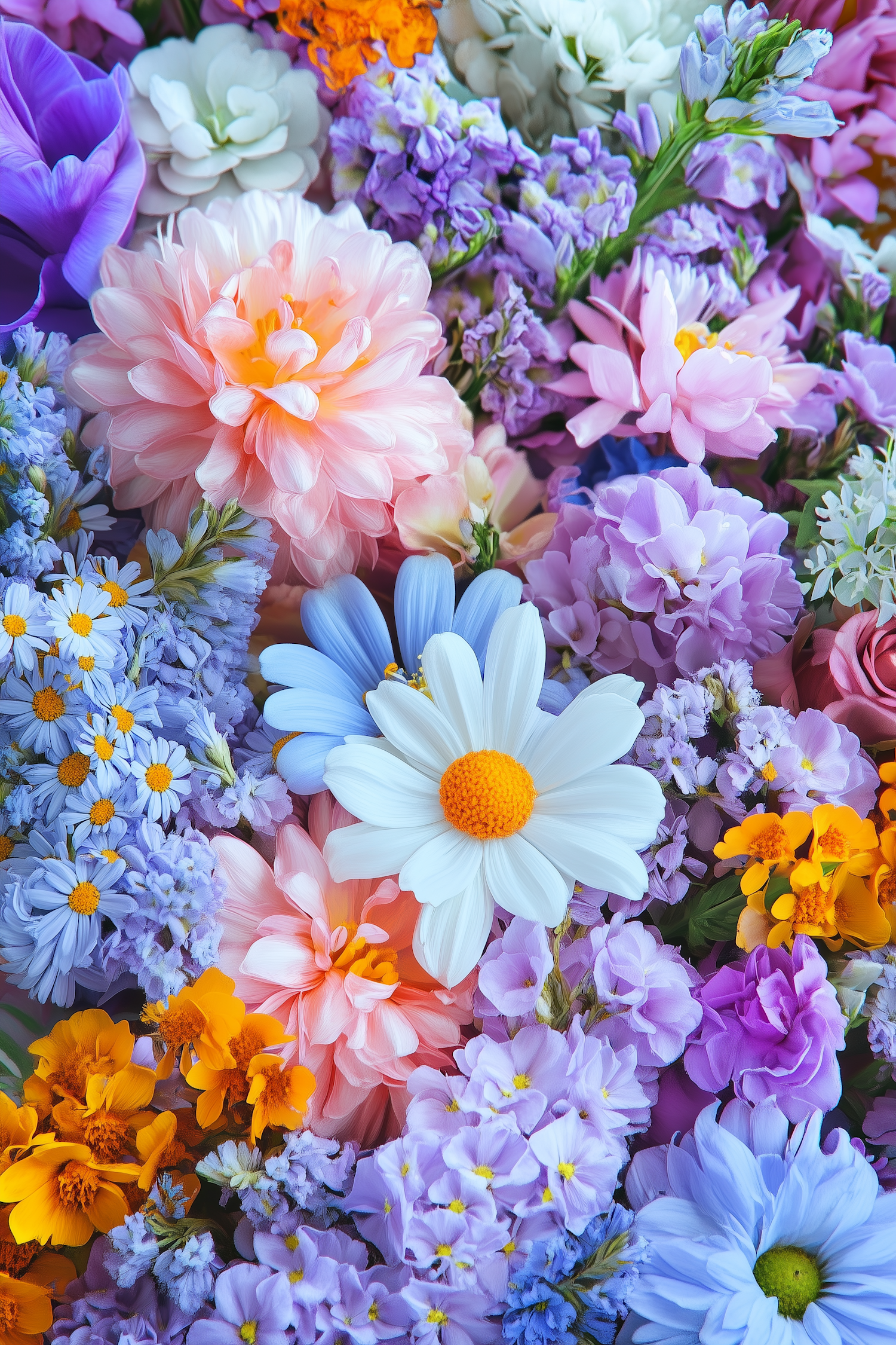 A vibrant bouquet of pink dahlias, blue daisies, and orange marigolds creates a colorful floral display.