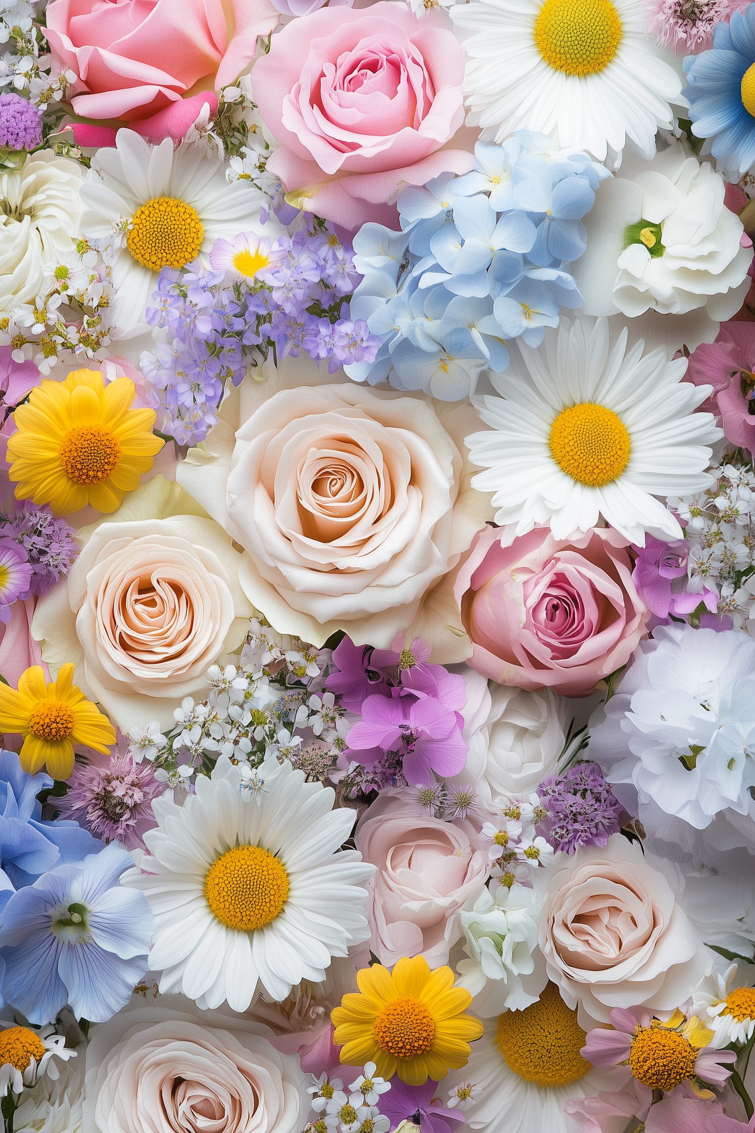 Vibrant floral arrangement with pink roses, white daisies, blue hydrangeas, and yellow marigolds creating a colorful tapestry.