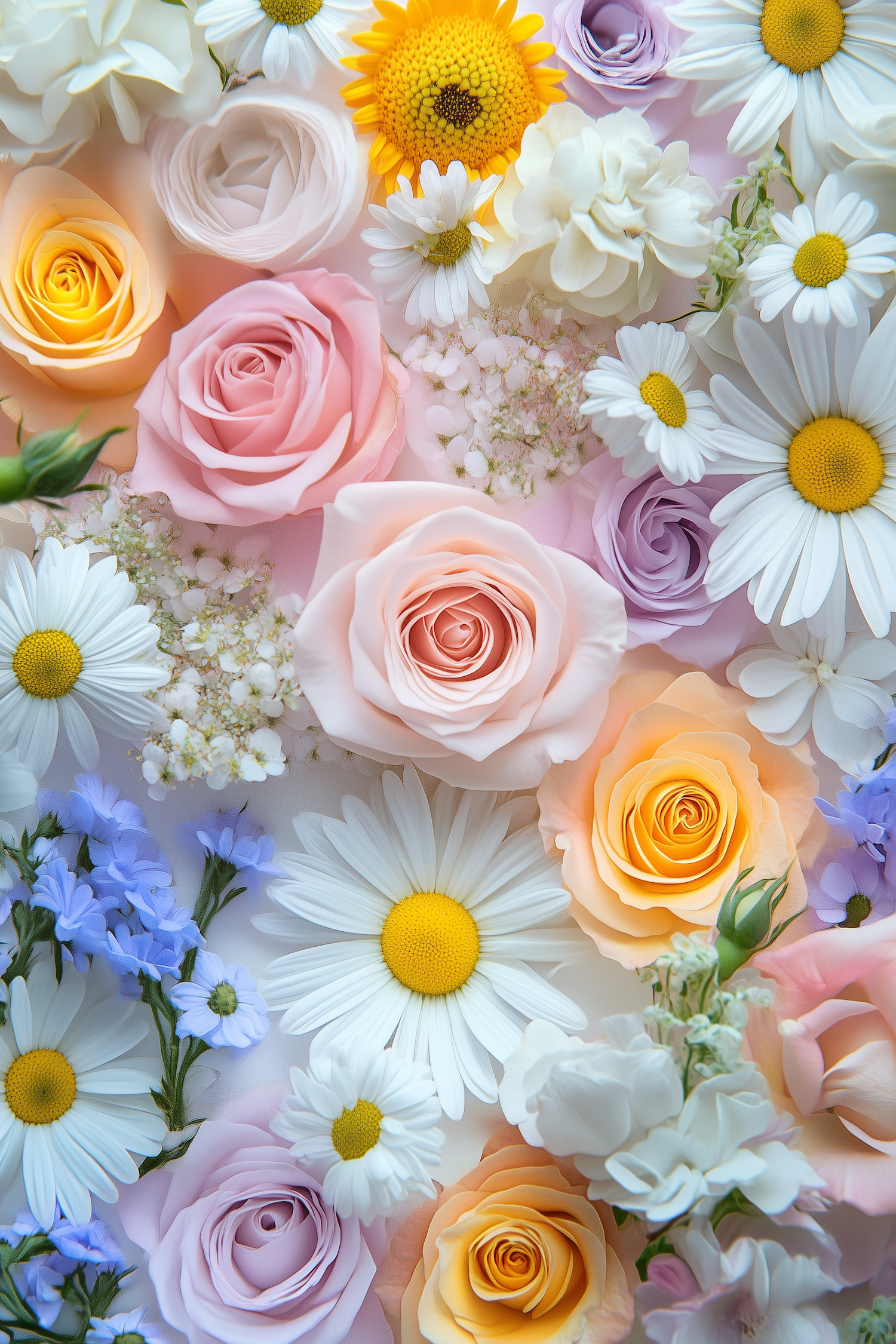 A beautiful arrangement of pastel roses, daisies, and small flowers in soft hues, creating a harmonious and vibrant floral display.