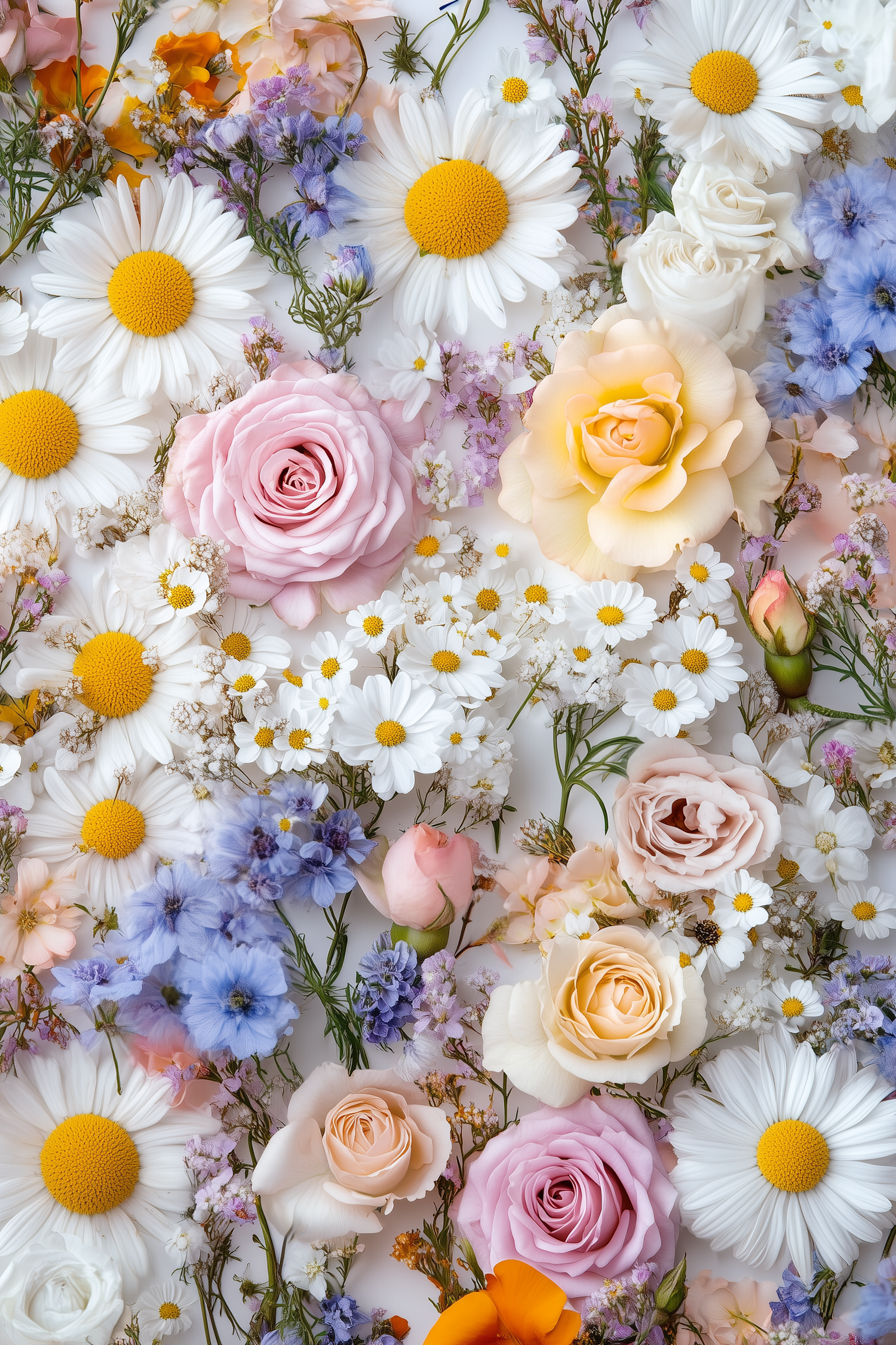 A colorful floral arrangement with daisies, roses, and blue flowers, creating a vibrant and harmonious display.