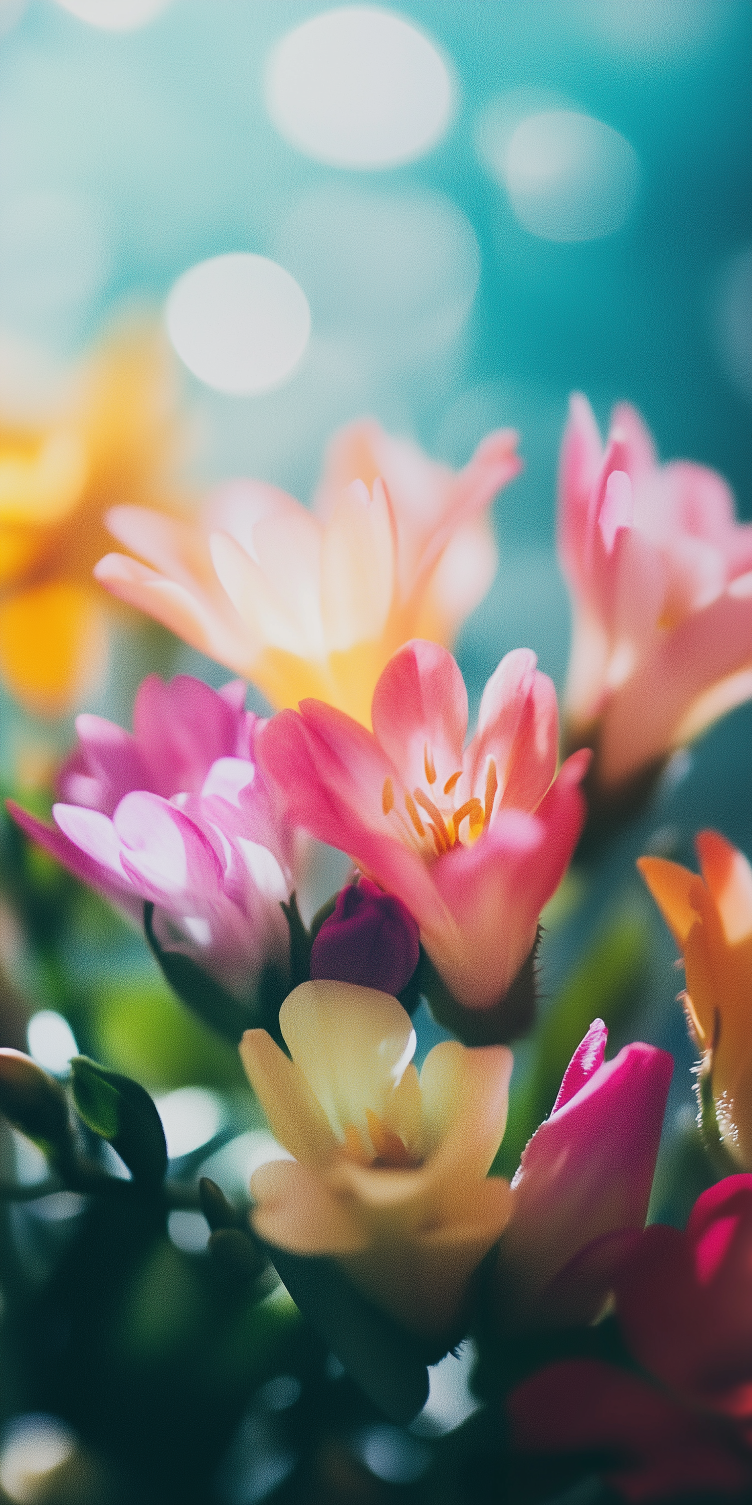 Vibrant close-up of colorful flowers with a dreamy teal bokeh background, highlighting pink, orange, yellow, and purple blooms.