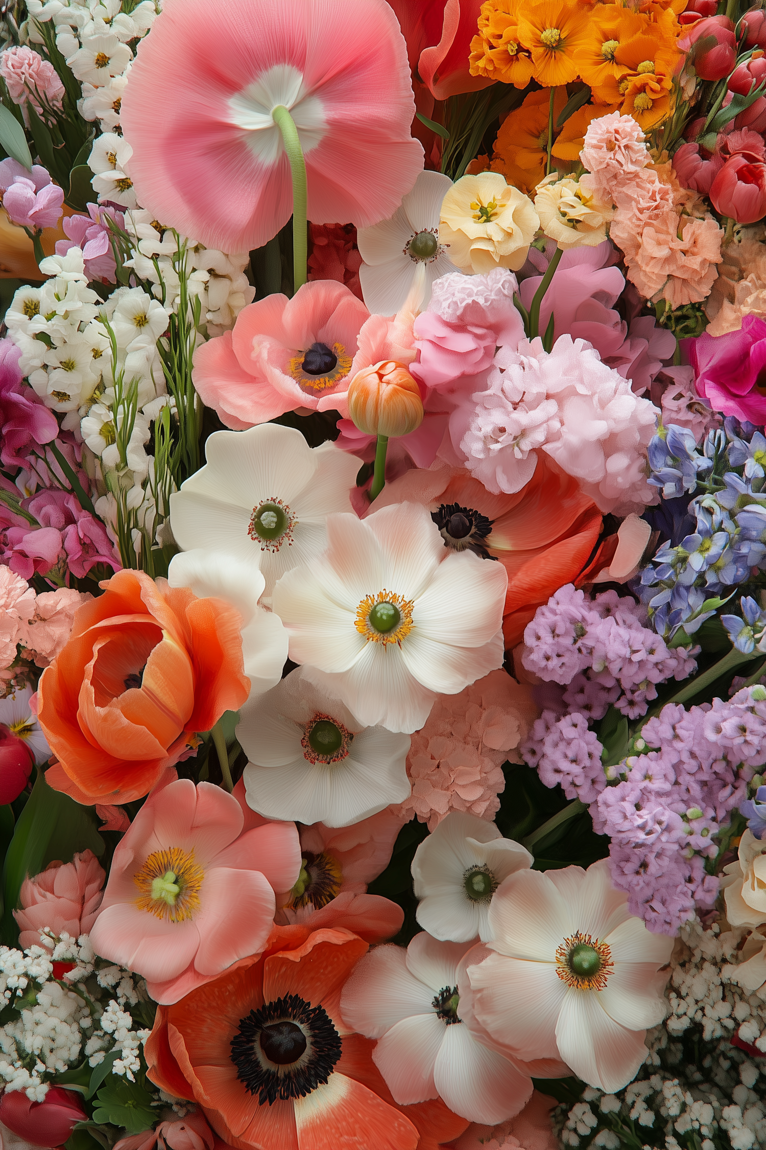 A vibrant floral arrangement with pink, white, orange, and yellow flowers, creating a lush and colorful tapestry.