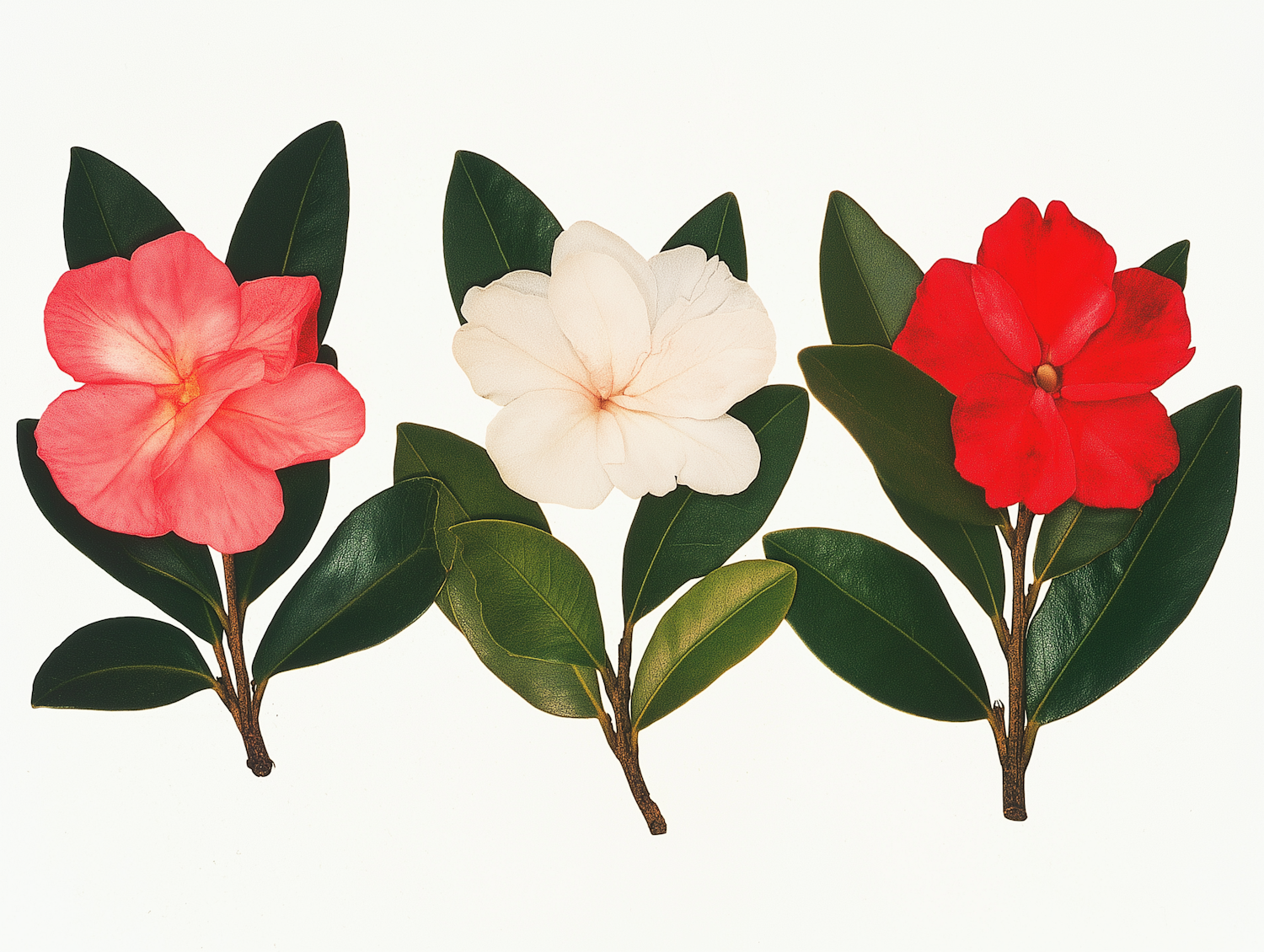 Three vibrant flowers in pink, white, and red with lush green leaves on a white background, showcasing natural beauty and color contrast.