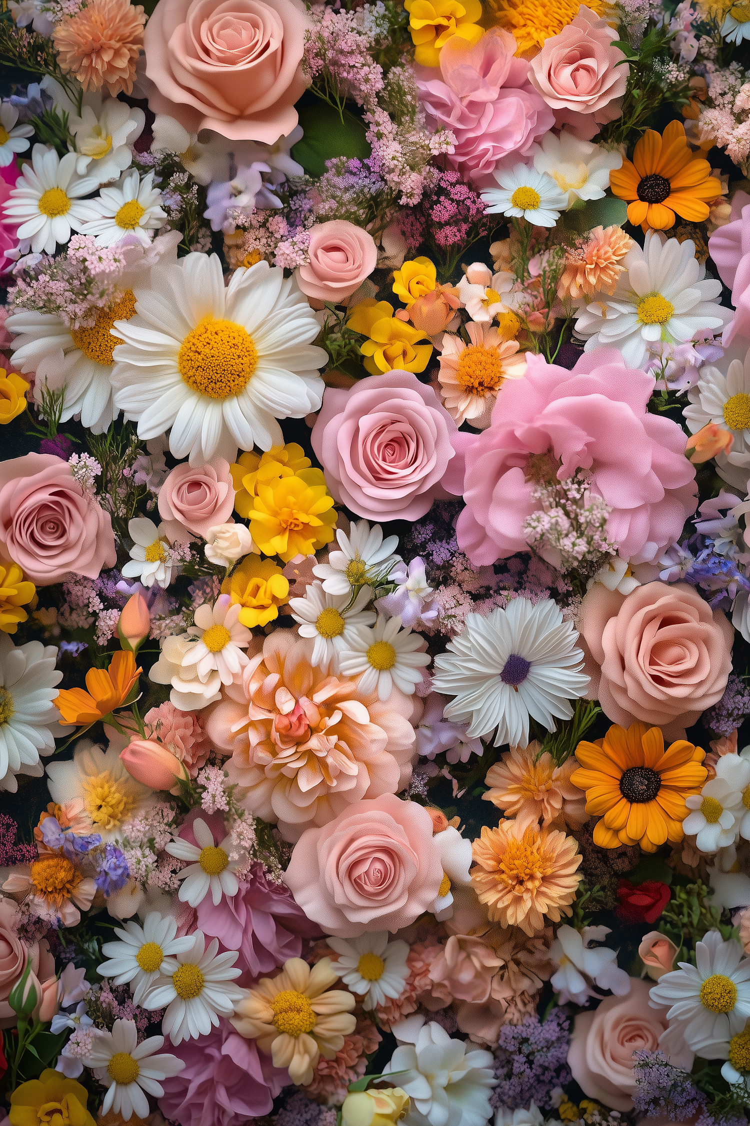 A lush floral arrangement with pink roses, yellow and white daisies, and various colorful blooms creating a vibrant display.