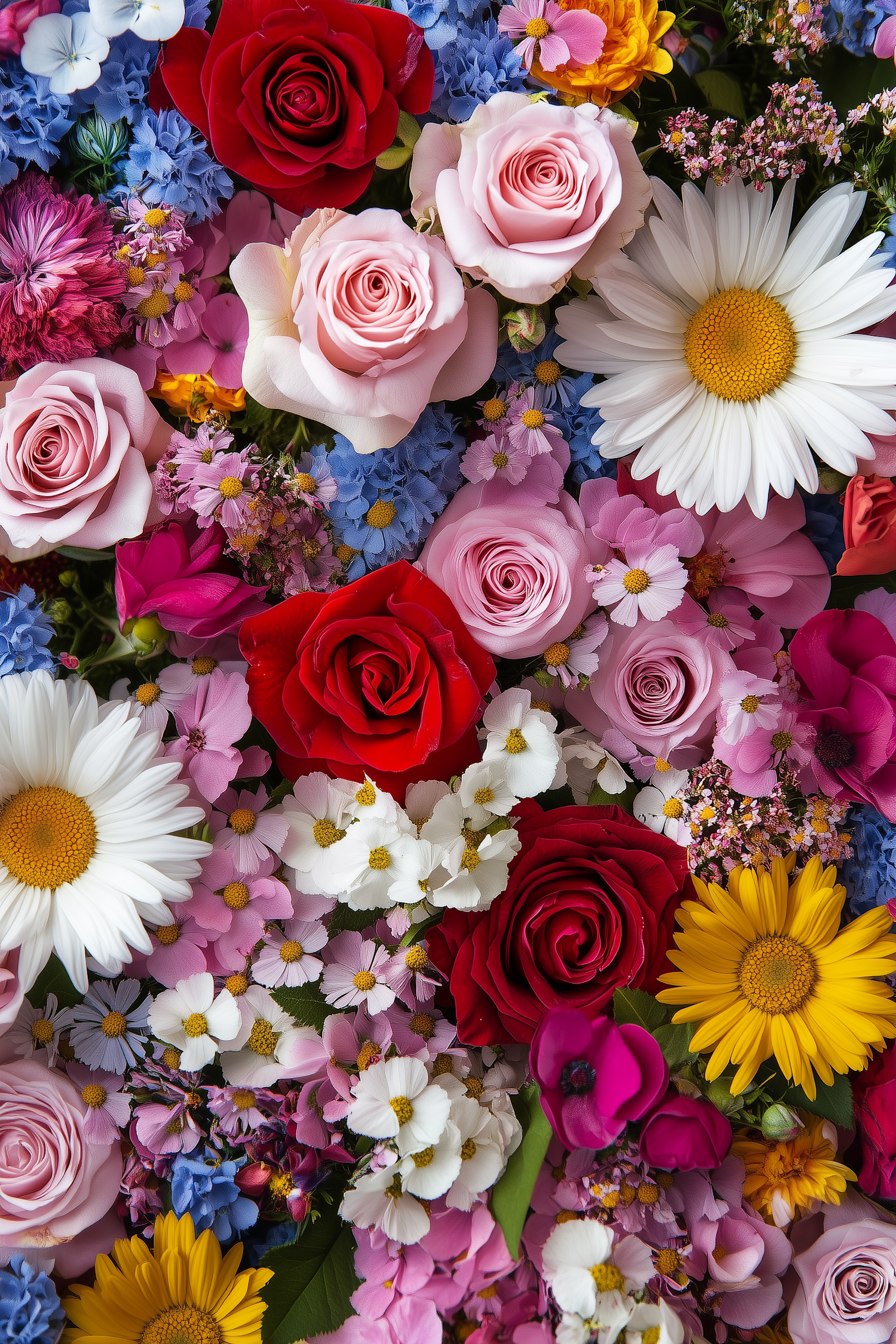 A vibrant floral arrangement with red roses, pink roses, white daisies, blue hydrangeas, and yellow sunflowers.