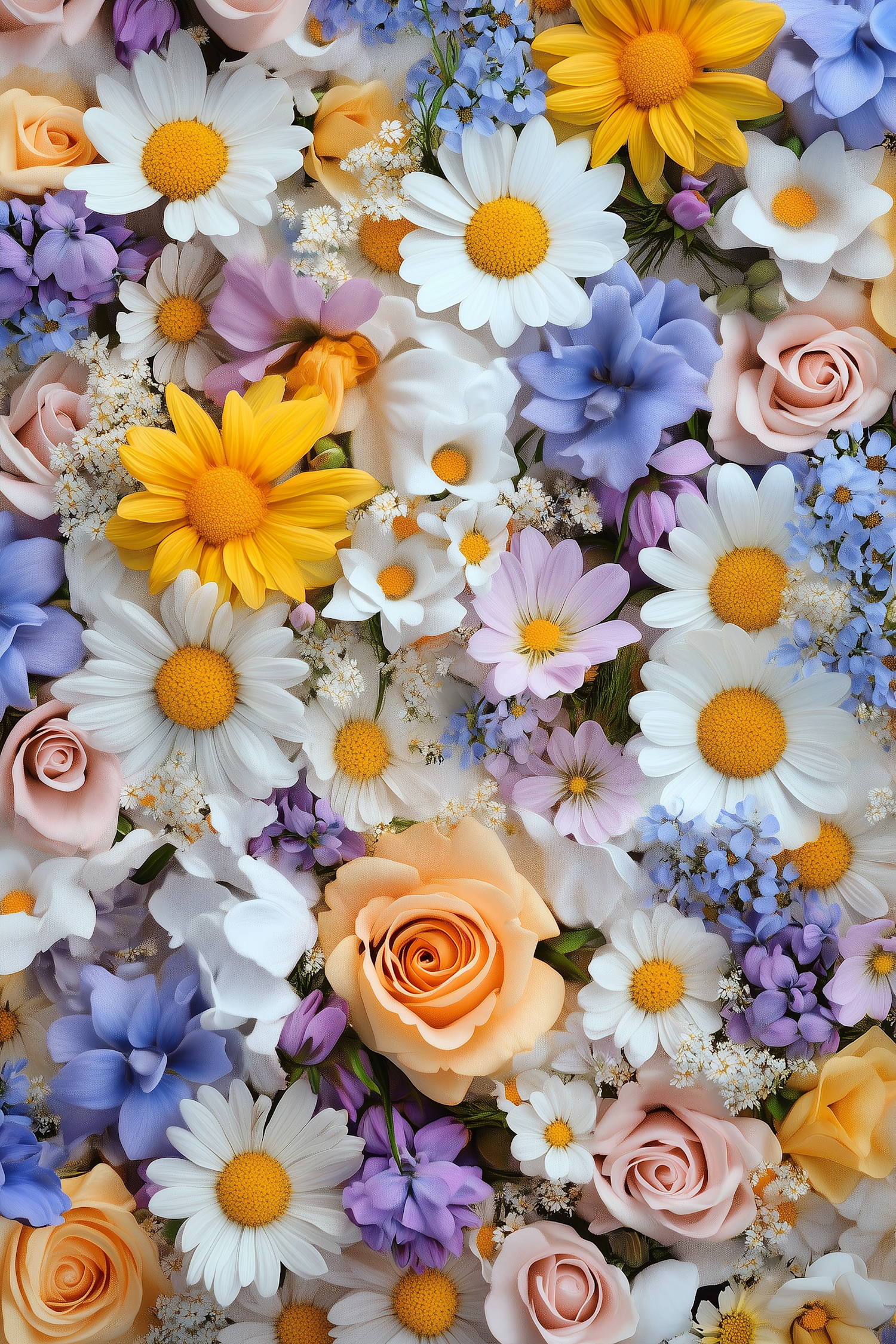 A vibrant floral arrangement with daisies, roses, and colorful blossoms in yellow, white, peach, purple, and blue hues.