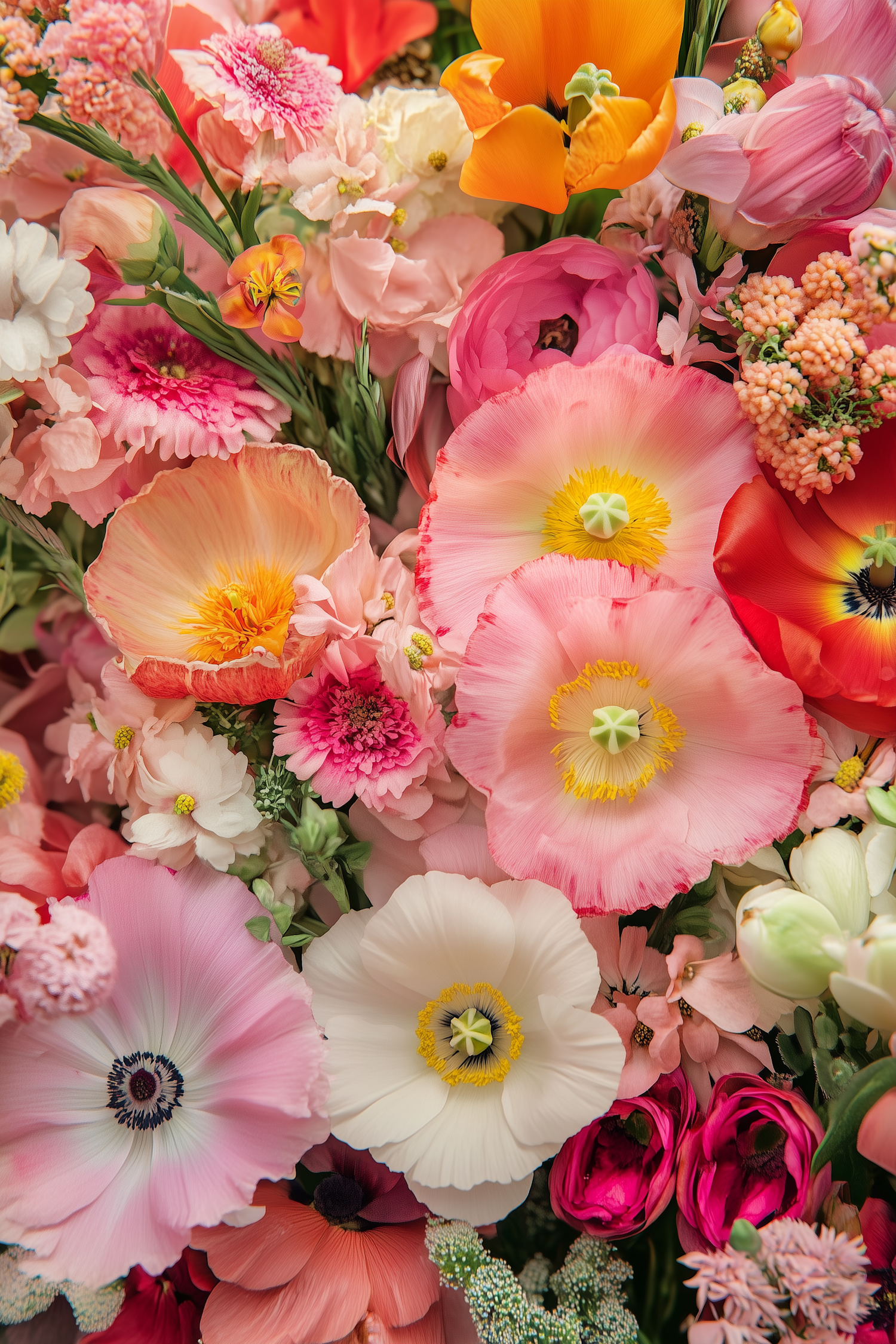 A lush bouquet of pink, orange, and white flowers with poppies, roses, and peonies, creating a vibrant and elegant floral display.
