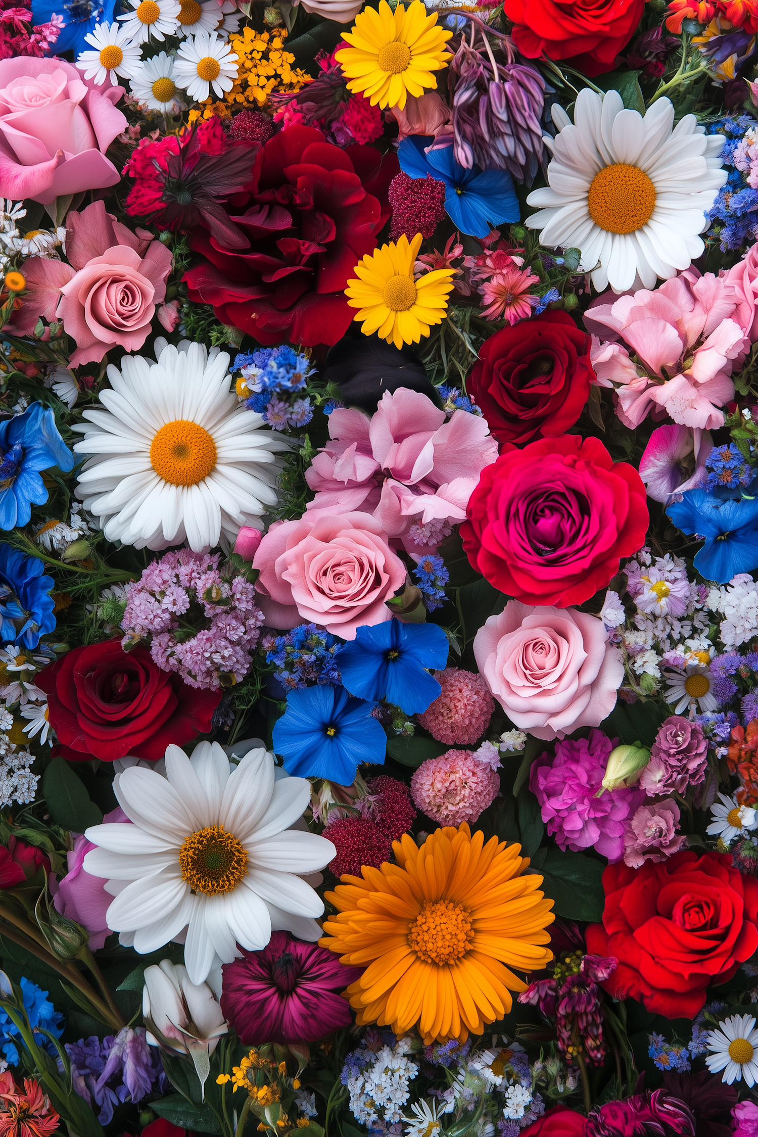 A vibrant floral arrangement with roses, daisies, and colorful blooms in reds, pinks, yellows, blues, and whites.