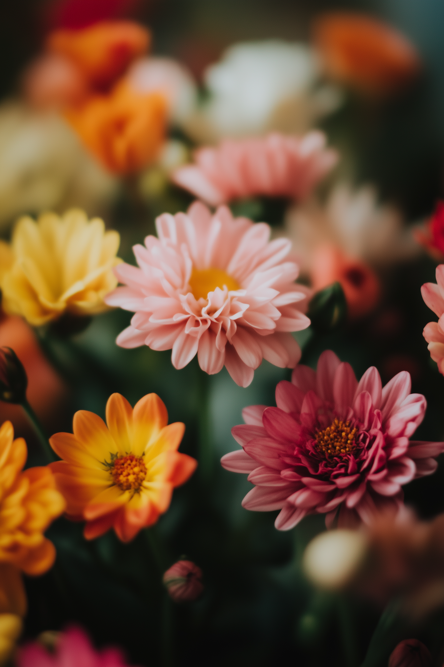 Close-up of vibrant flowers in pink, yellow, and orange hues, showcasing intricate petal details and a soft, blurred background.