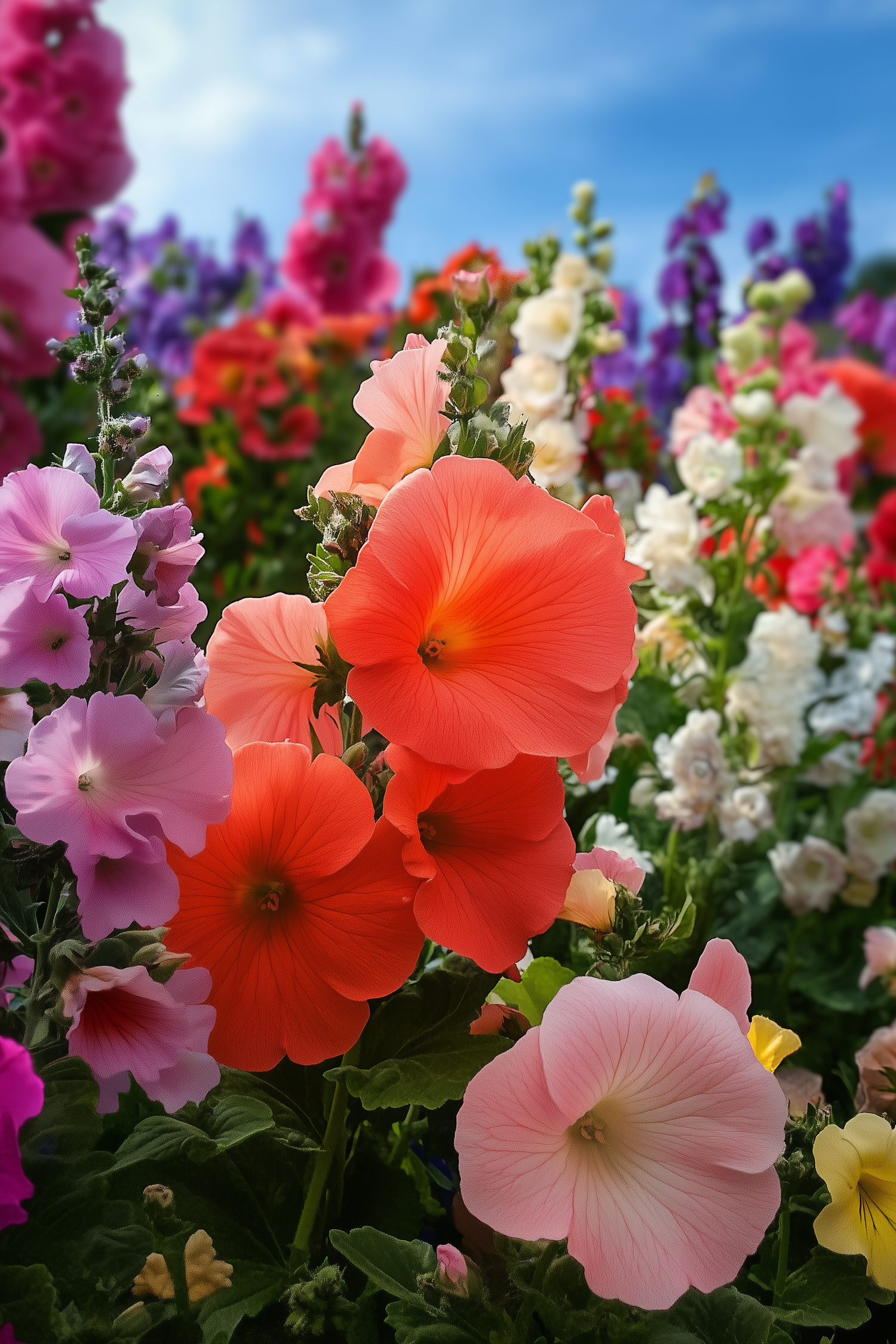 A vibrant garden with colorful flowers in orange, pink, purple, and white against a clear blue sky, creating a lively and cheerful scene.