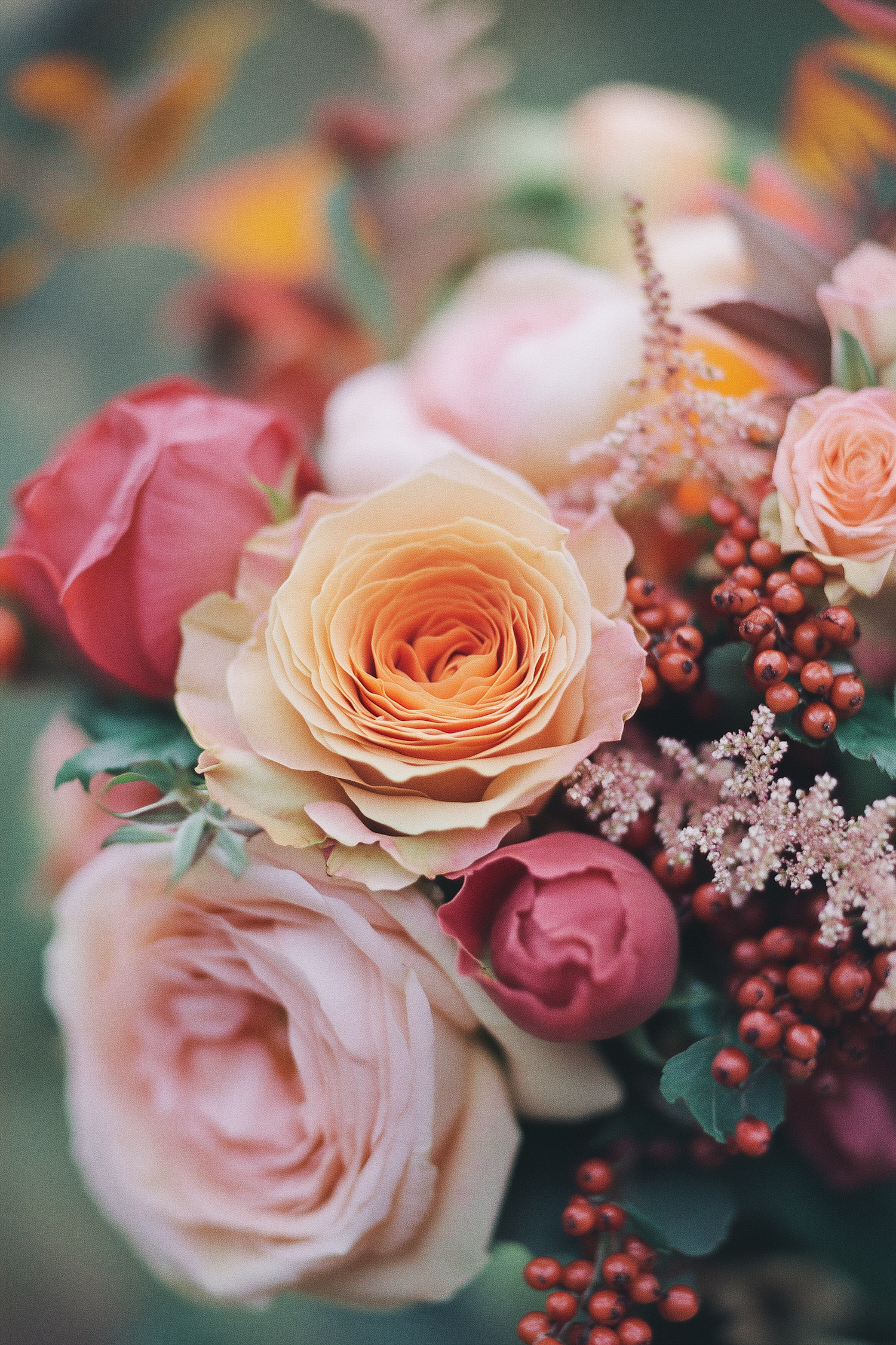 A lush bouquet of roses in peach, pink, and red, accented with red berries and soft greenery, creating a vibrant floral display.