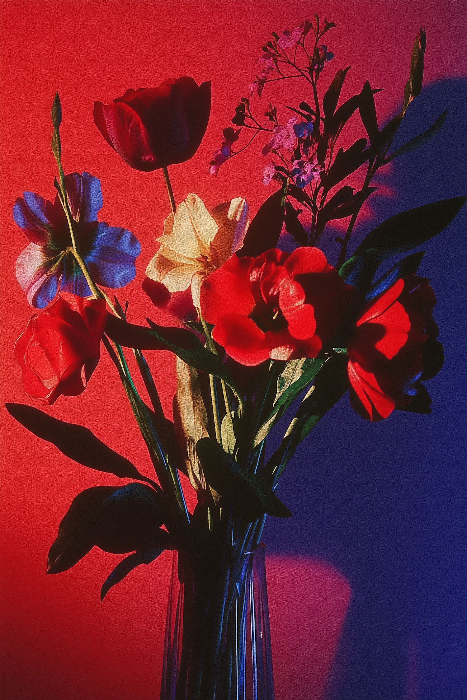 A colorful bouquet of flowers in a glass vase, set against a dramatic red and blue gradient background with artistic lighting.