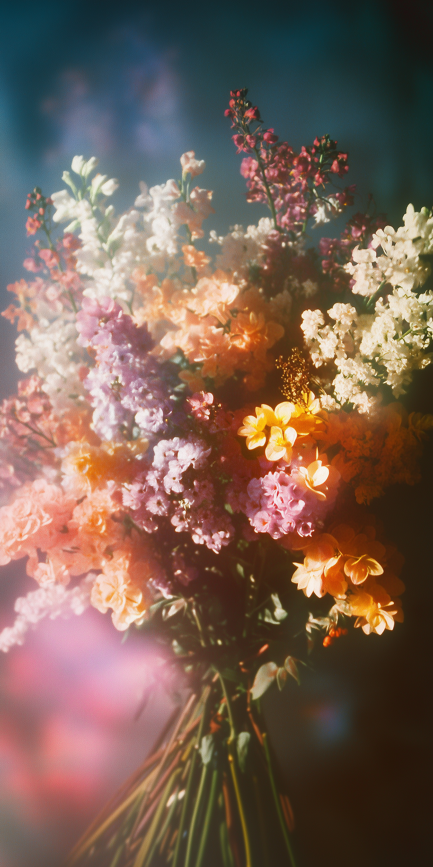 A dreamy bouquet of colorful flowers with soft lighting, featuring pink, orange, yellow, and white blooms in a lush arrangement.