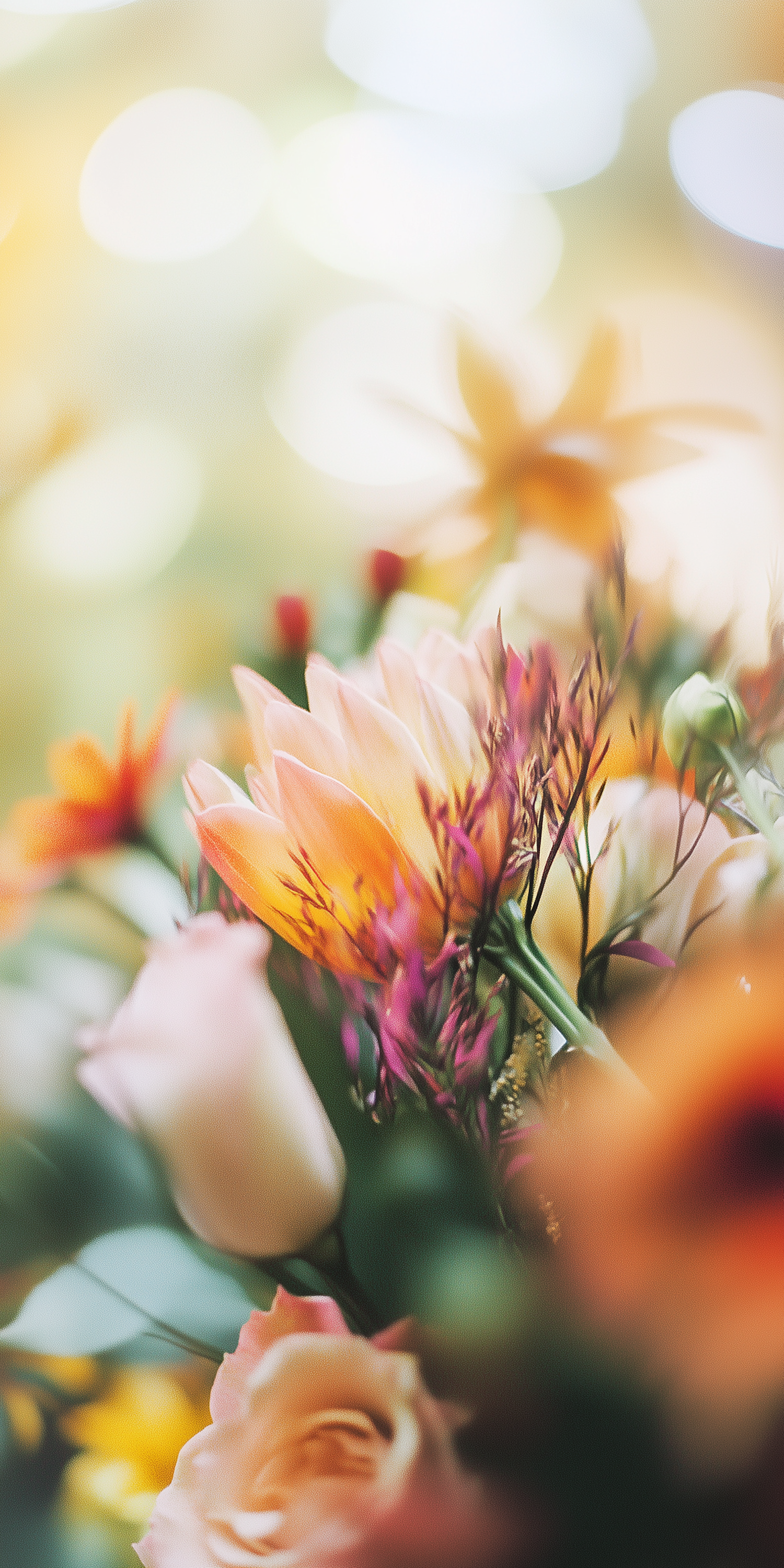 Close-up of a vibrant floral bouquet with peach tulip, purple sprigs, and warm bokeh lights in a dreamy, soft-focus setting.