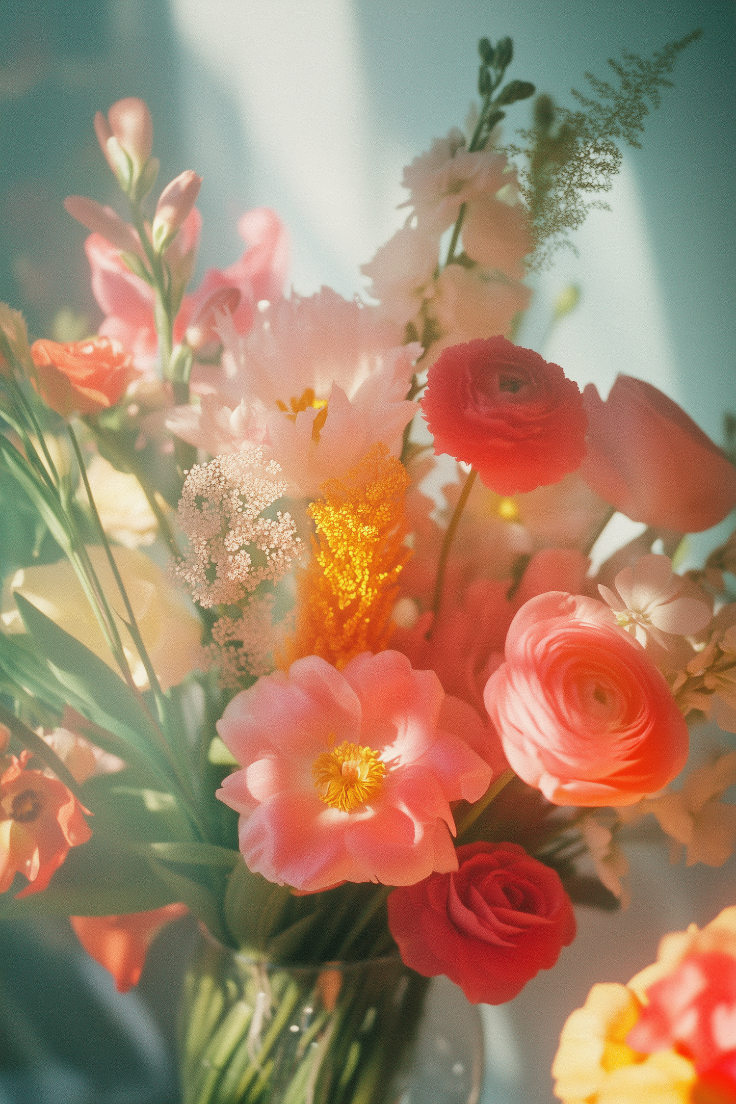 A vibrant bouquet of pink, red, and yellow flowers in a glass vase, bathed in warm sunlight against a soft blue background.