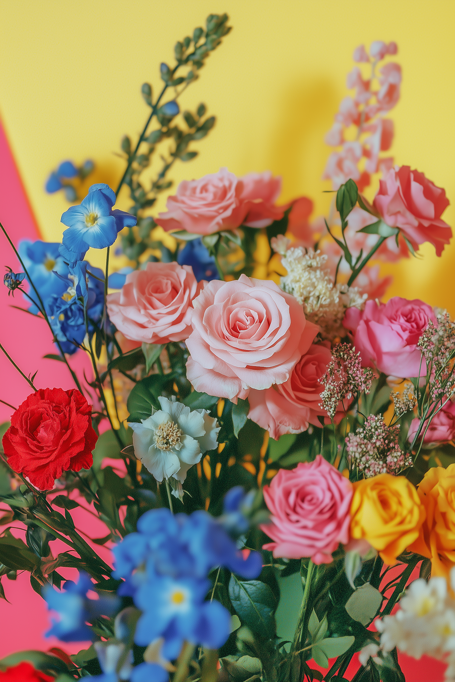 A colorful bouquet of pink, red, yellow, and blue flowers pops against a bold yellow and pink background.