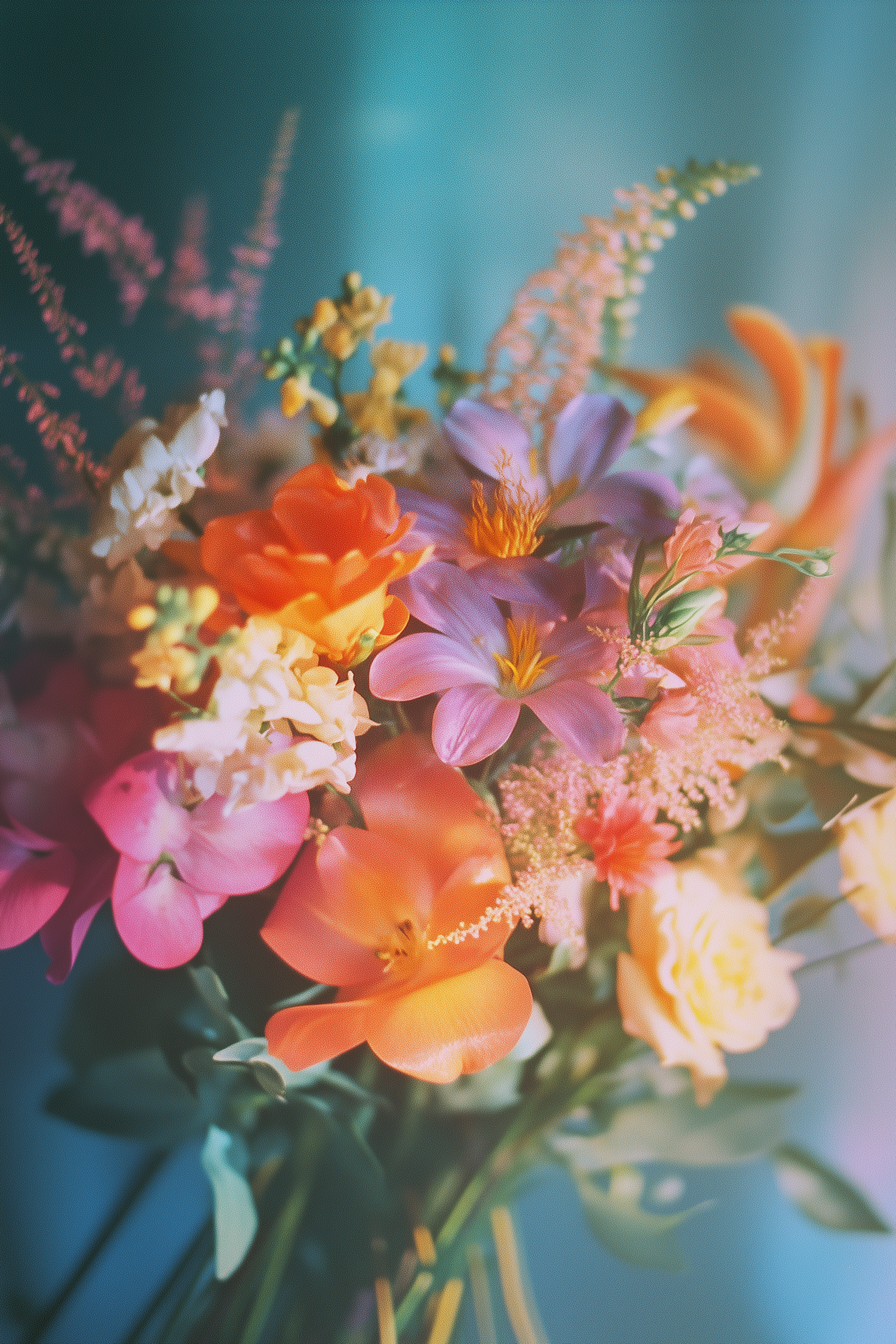 A vibrant bouquet of colorful flowers against a soft teal background, showcasing orange, pink, purple, and yellow blooms.