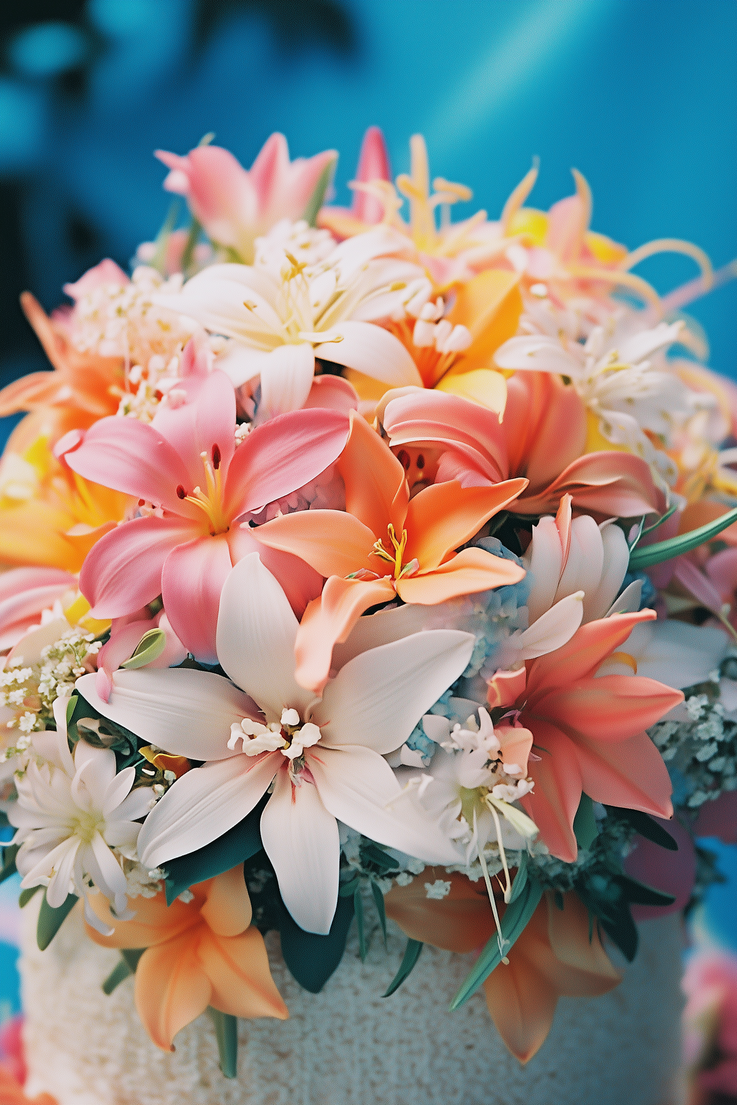Vibrant bouquet of pink, orange, and white lilies with a soft blue background, creating a fresh and elegant floral display.
