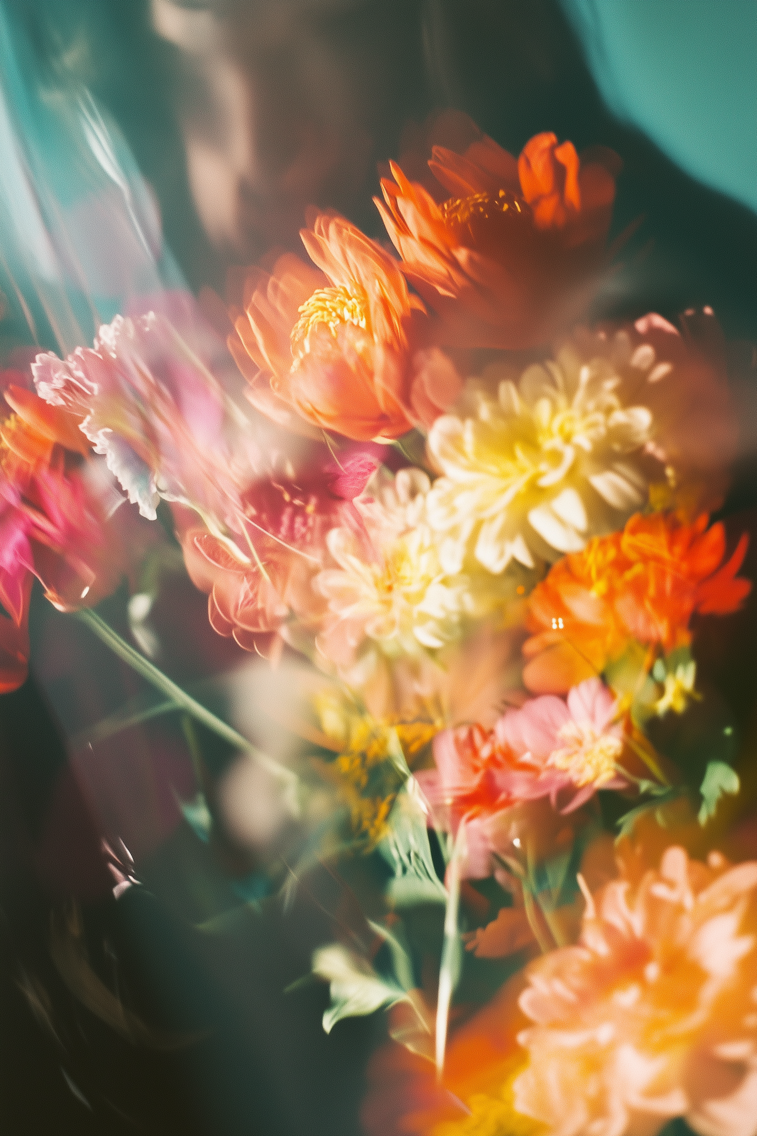 Dreamy bouquet of orange, yellow, and pink flowers with a blurred figure in the background, creating an ethereal and tranquil scene.