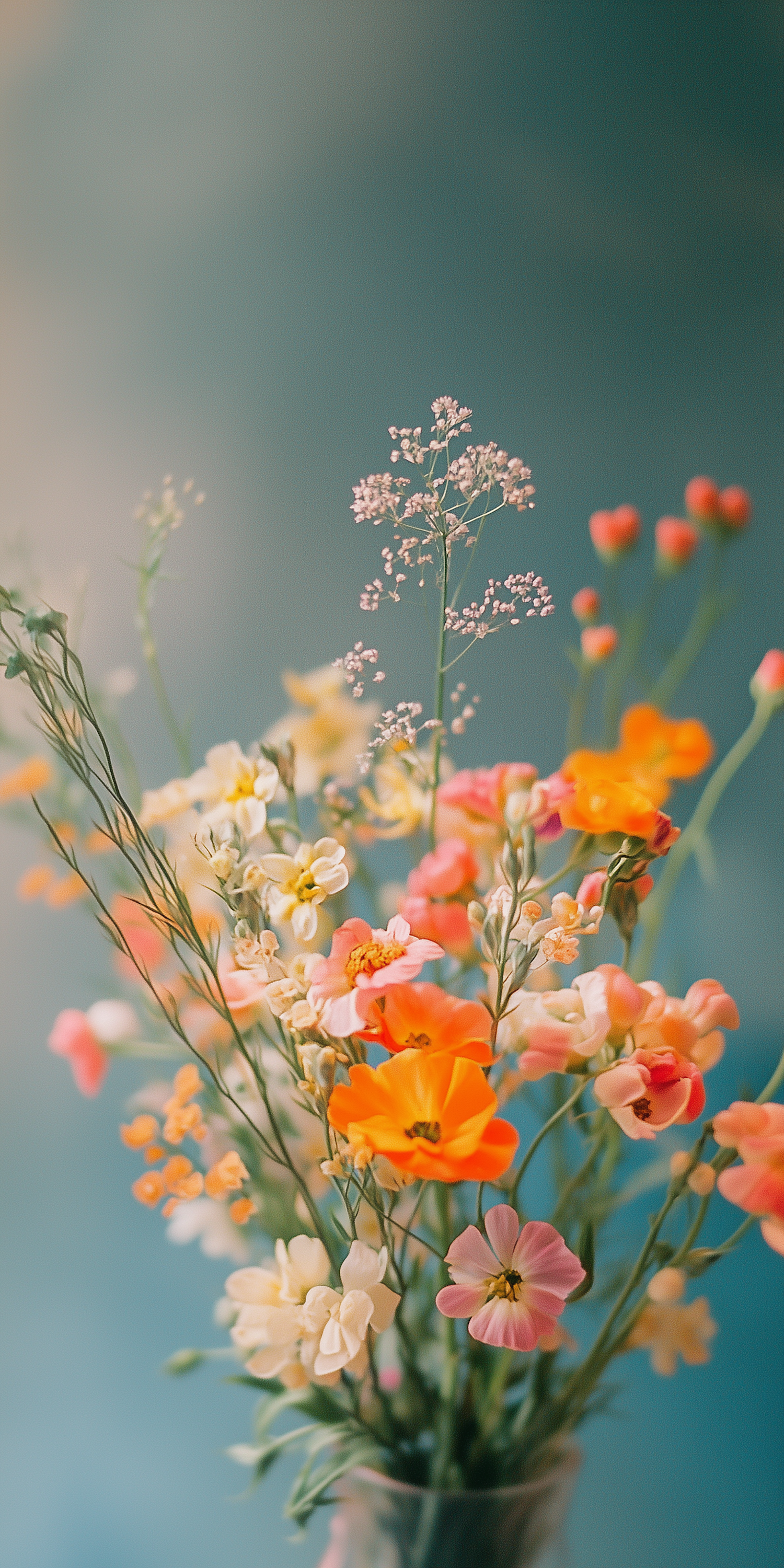Vibrant bouquet with orange, pink, and white flowers against a soft teal background, creating a lively and soothing visual effect.