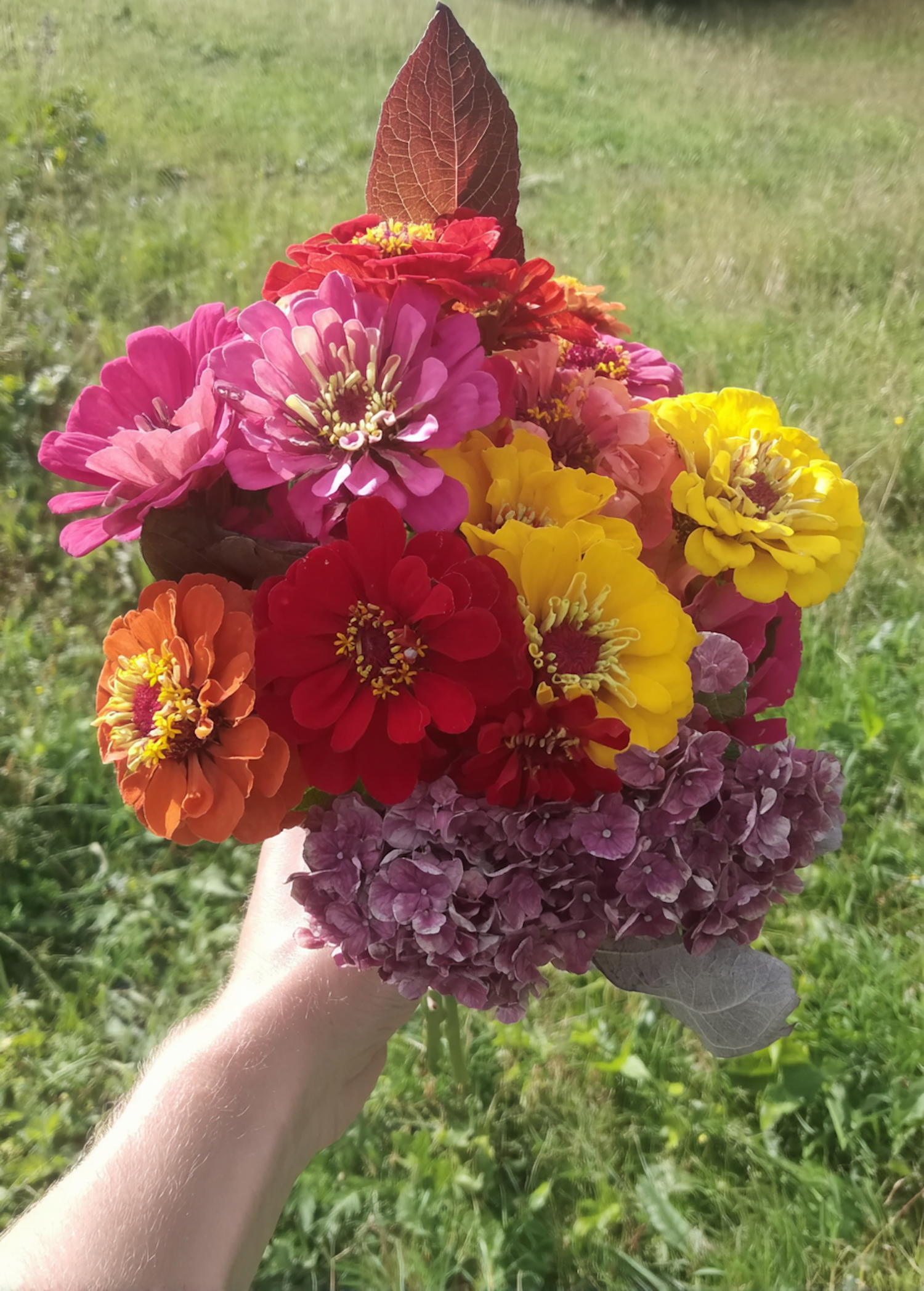 A colorful bouquet of flowers held in a hand, featuring vibrant yellow, red, orange, and pink blooms with a grassy field in the background.