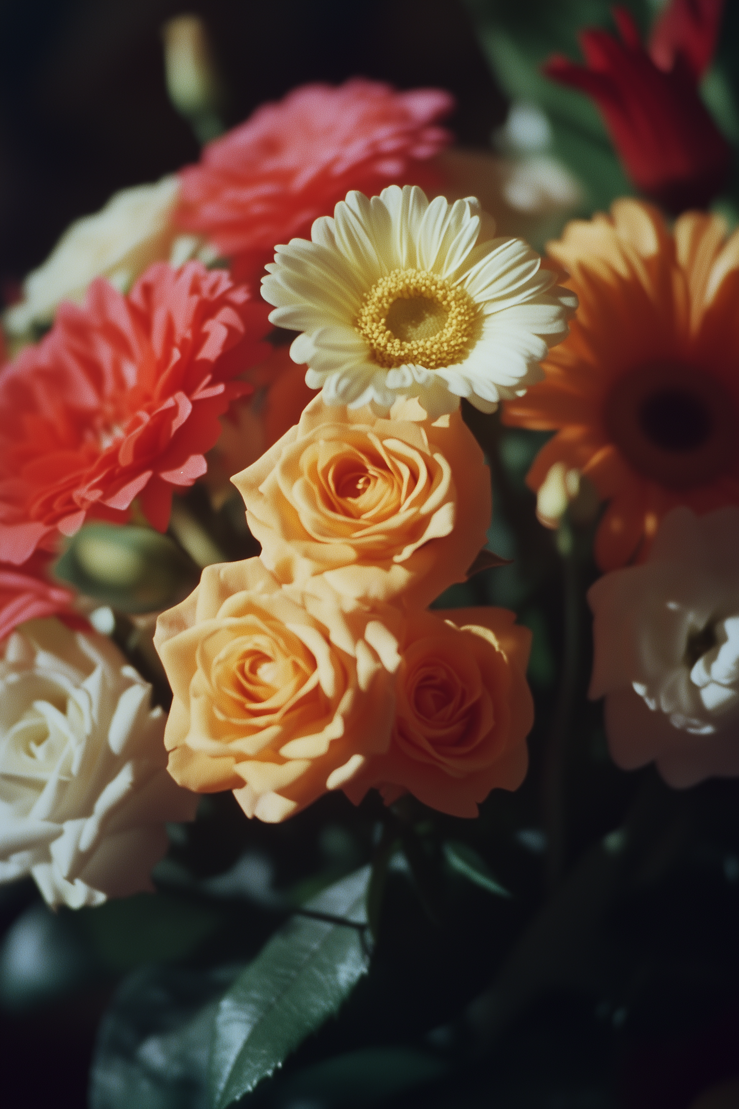 A vibrant bouquet with yellow roses, pink and orange gerberas, and a white daisy, set against a lush green background.