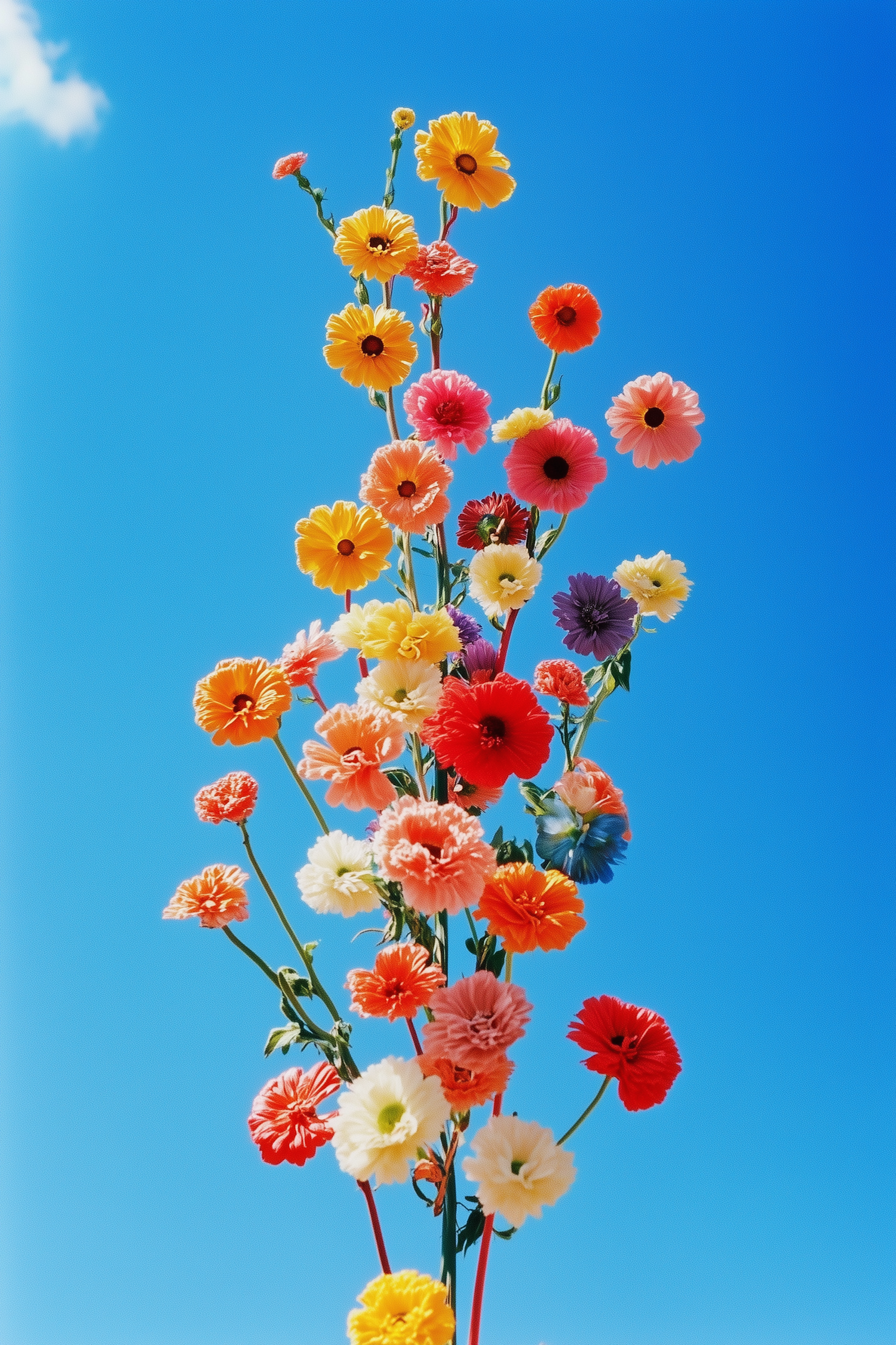 A colorful bouquet of flowers in red, yellow, pink, and more pops against a bright blue sky, perfect for a cheerful spring vibe.