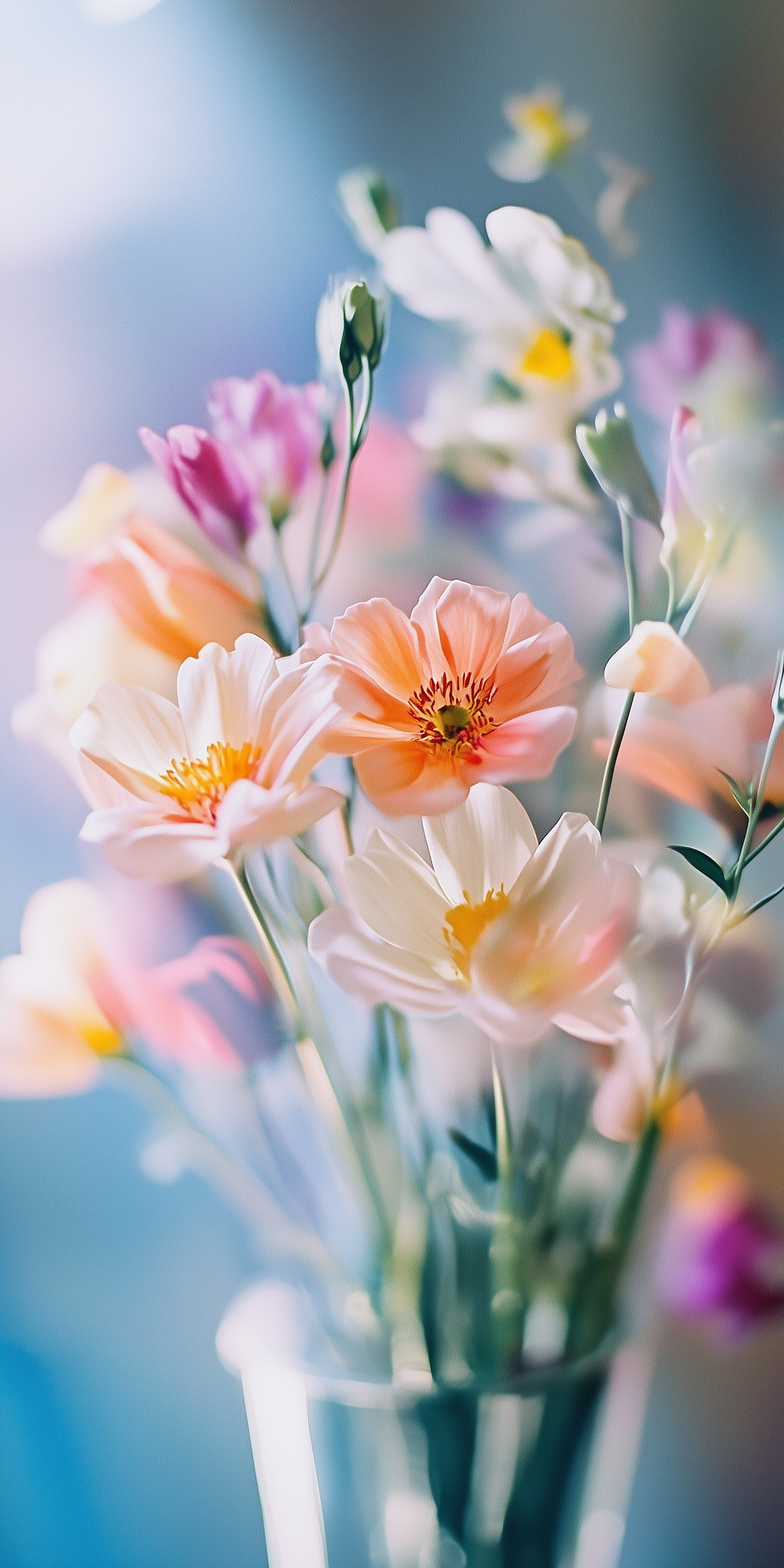 A dreamy bouquet of colorful flowers in a glass vase, with soft lighting and a blurred background for an ethereal effect.