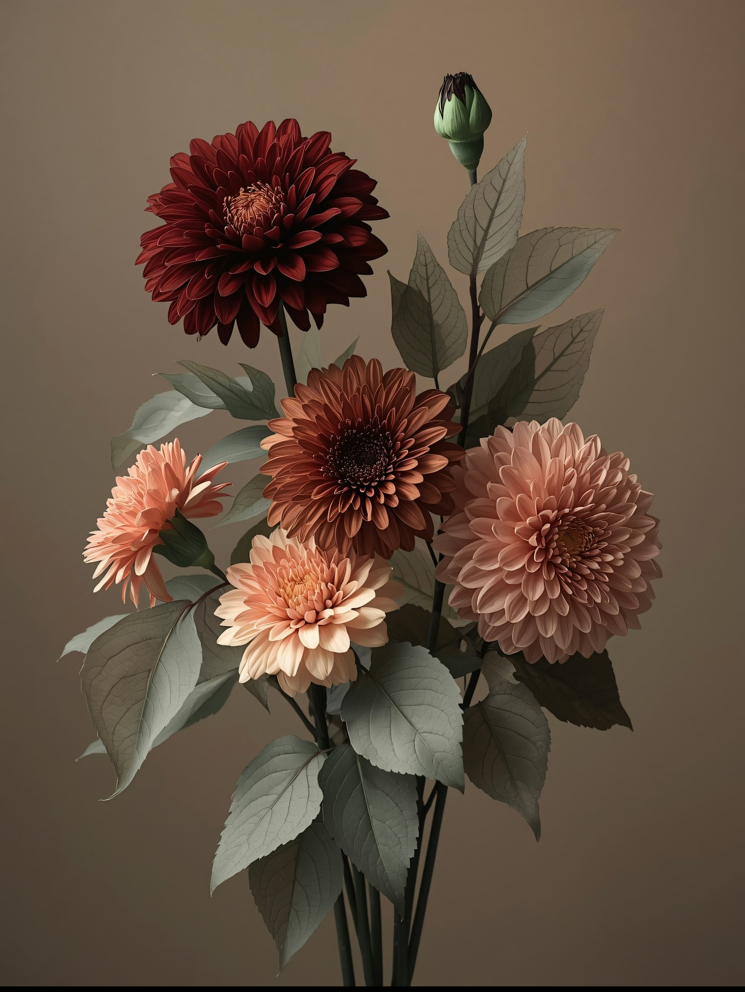 A stunning arrangement of red, peach, and pink dahlias with lush green leaves, set against a neutral background.