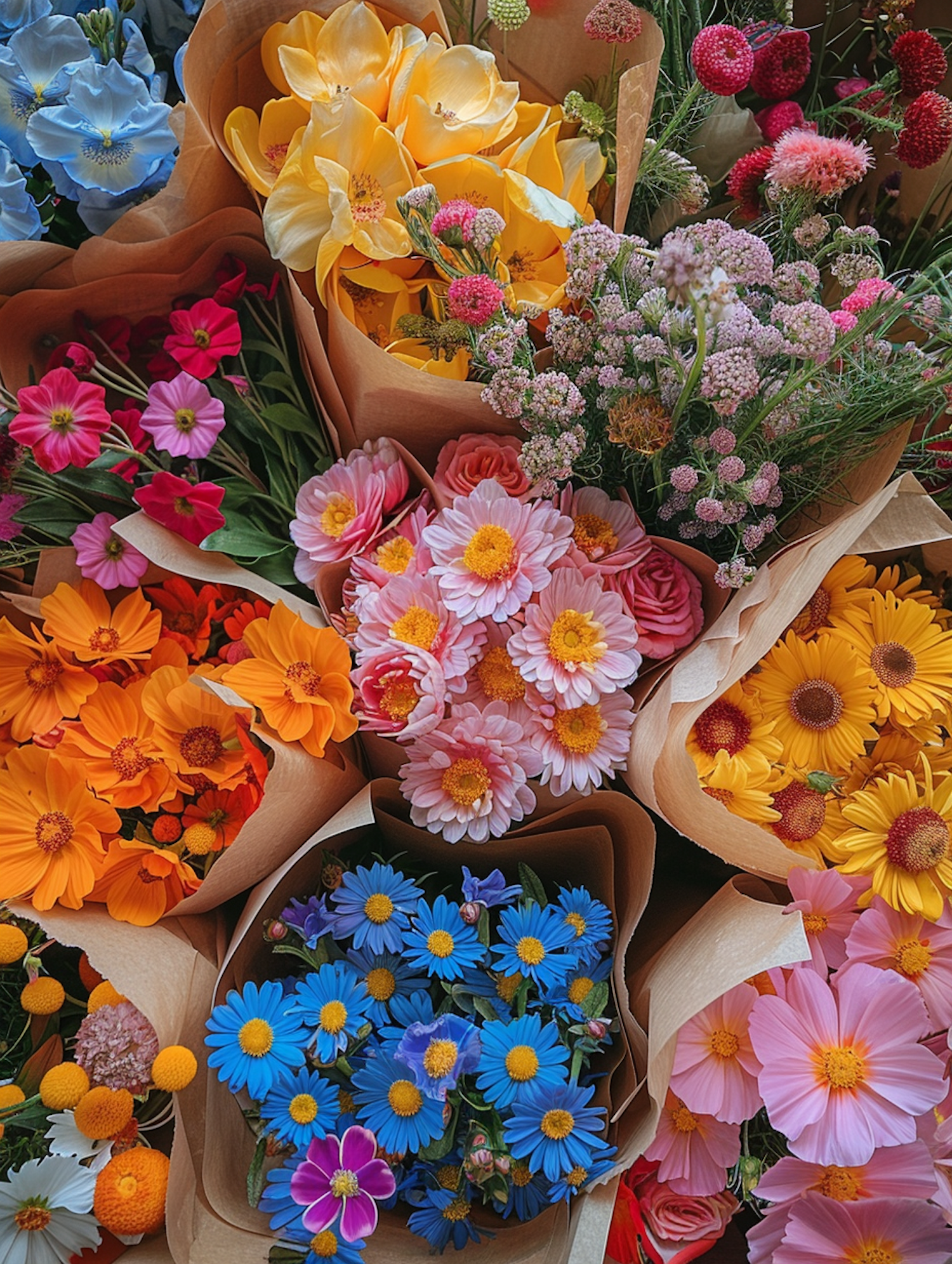 Colorful bouquets of flowers in paper wraps, featuring vibrant yellows, reds, pinks, blues, and oranges, creating a stunning floral display.