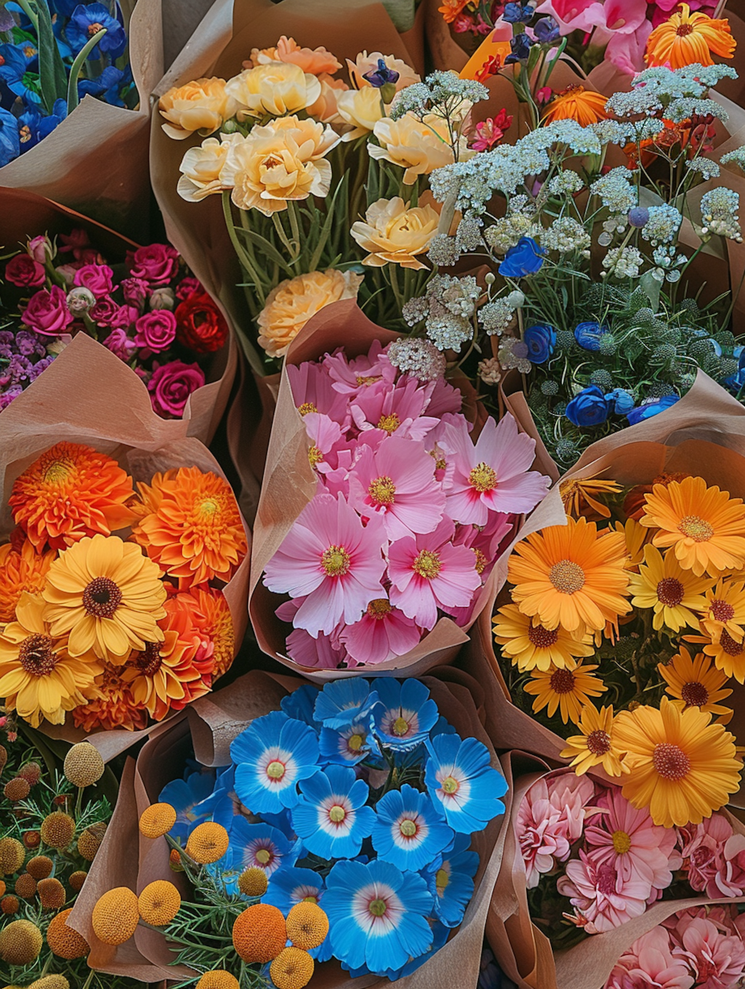 Vibrant flower bouquets wrapped in brown paper, featuring blue, pink, yellow, and orange blooms for a cheerful display.