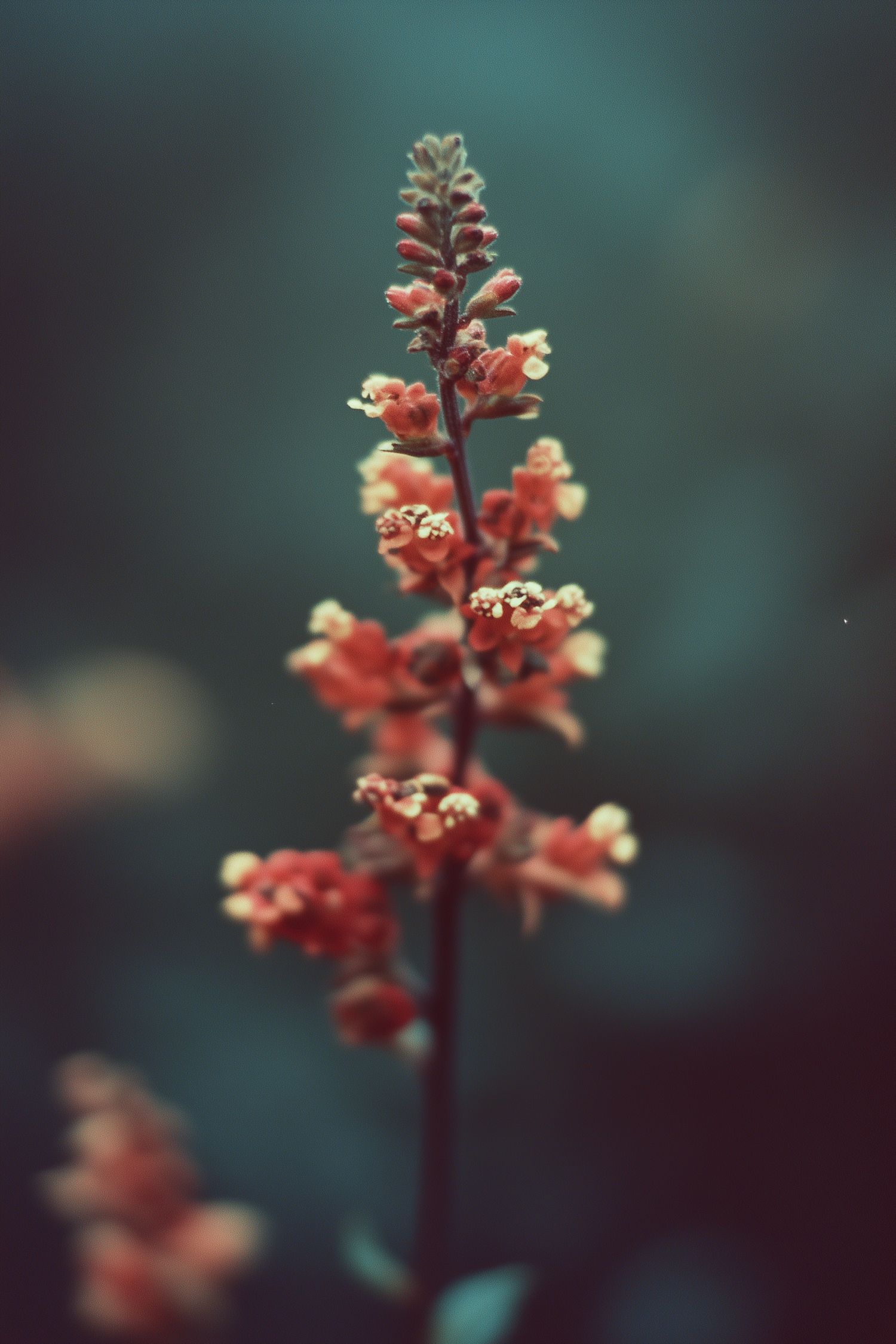 Close-up of vibrant red flowers on a slender stem against a blurred teal background, highlighting delicate petals and yellow stamens.