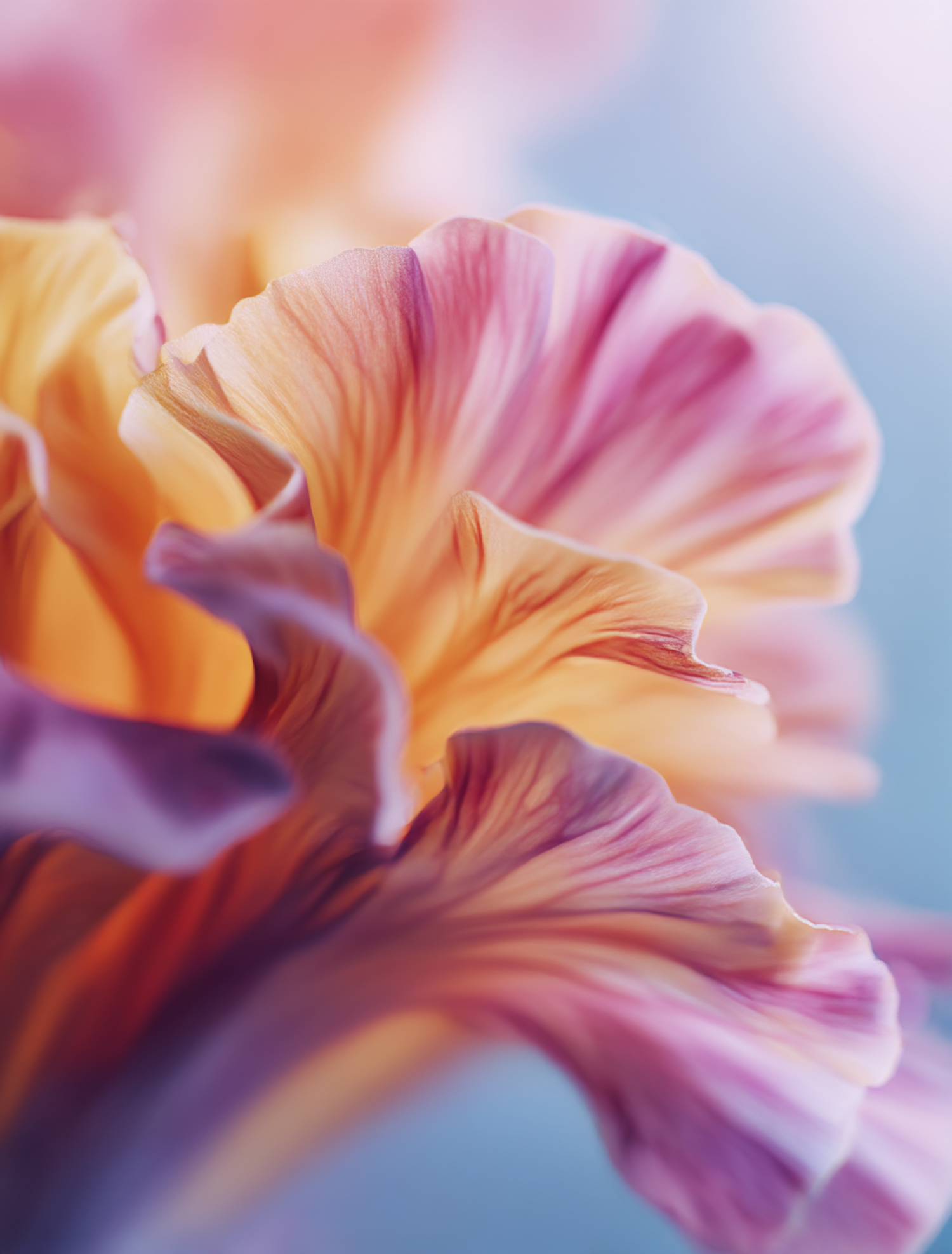 Close-up of vibrant flower petals with yellow and purple hues, showcasing intricate textures and soft lighting against a blurred background.