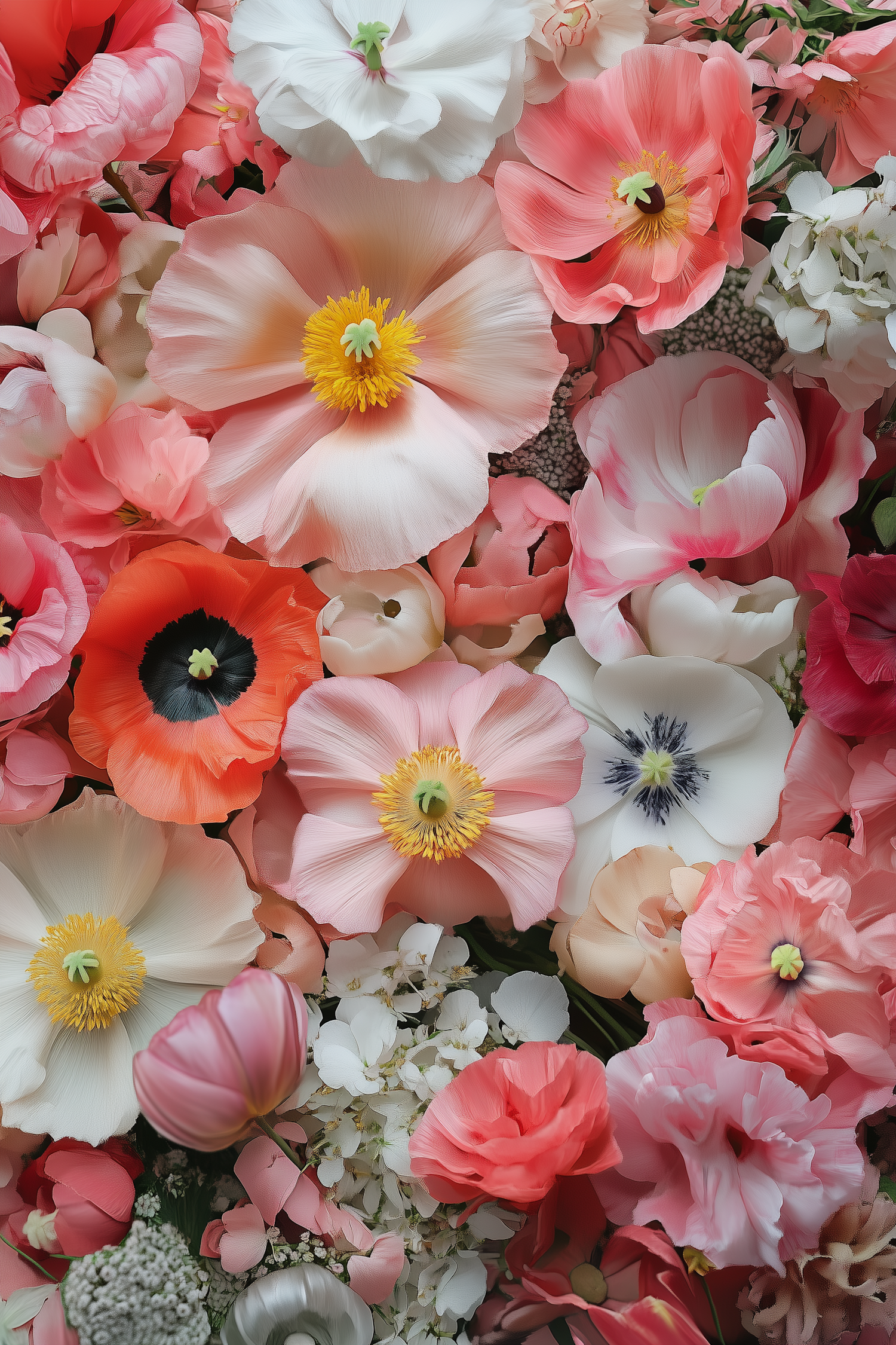 A lush floral arrangement with pink, coral, and white poppies, hydrangeas, and roses, creating a vibrant and harmonious display.