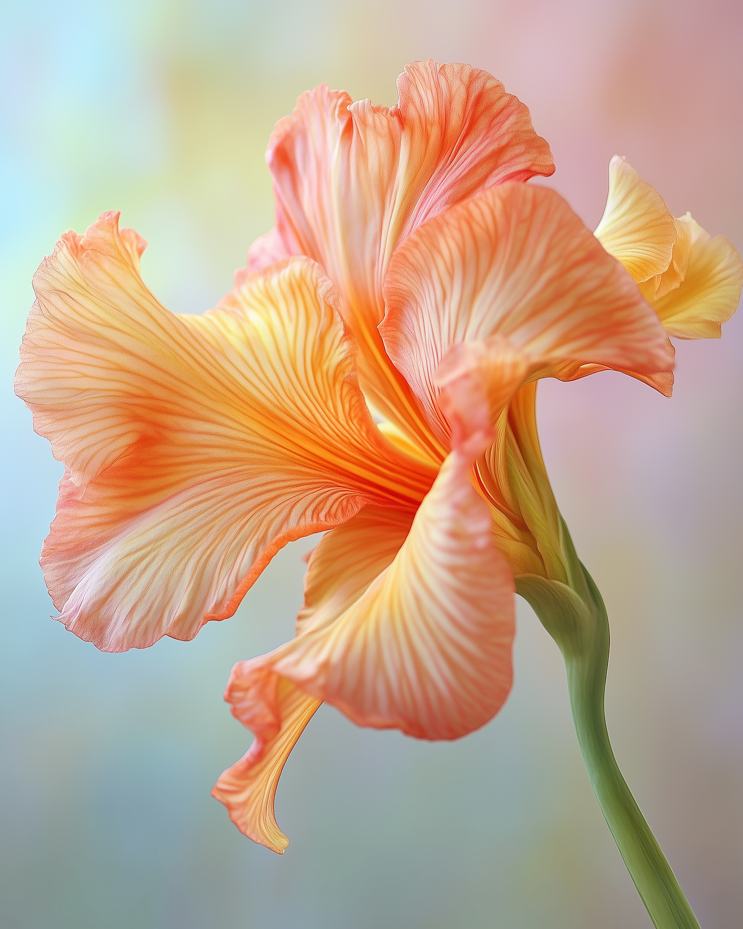 Close-up of a peach and orange flower with intricate petals against a soft pastel background.