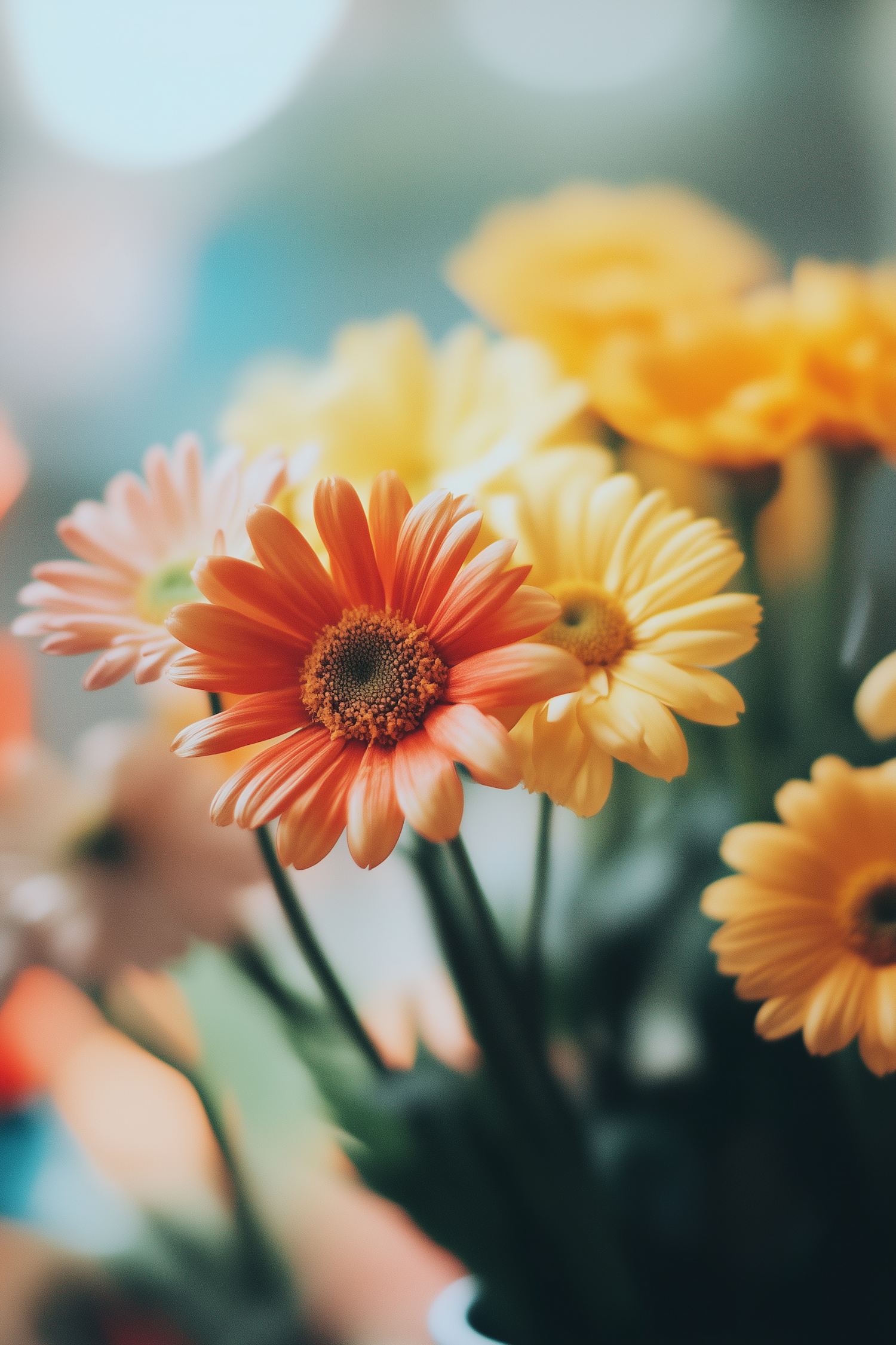 Close-up of vibrant orange and yellow daisies with a soft, blurred background, highlighting their delicate petals and natural beauty.